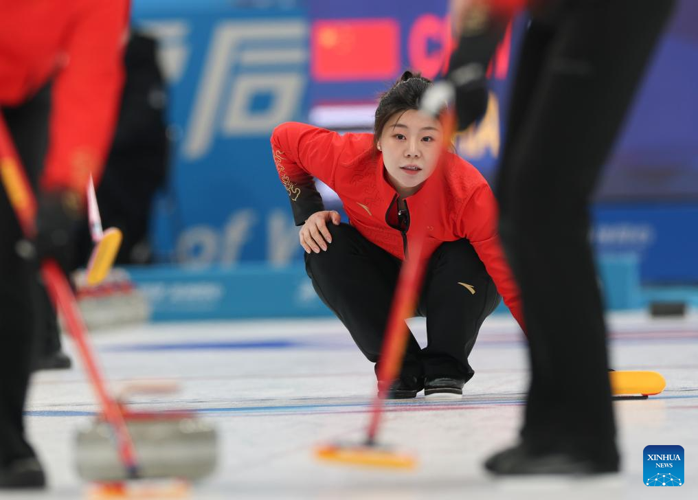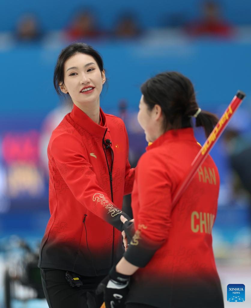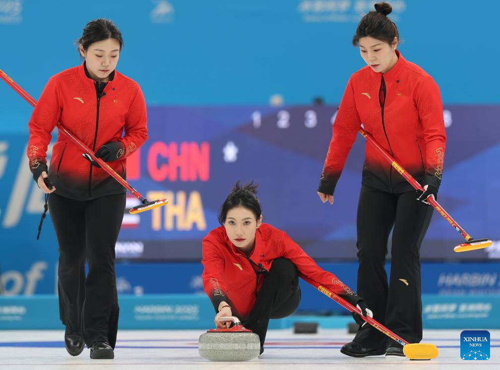 Wang Rui(C) of China competes during the Women's Round Robin Session 1 match between China and Thailand of the curling event at the 9th Asian Winter Games in Harbin, northeast China's Heilongjiang Province, Feb. 9, 2025. (Xinhua/Hu Xingyu)