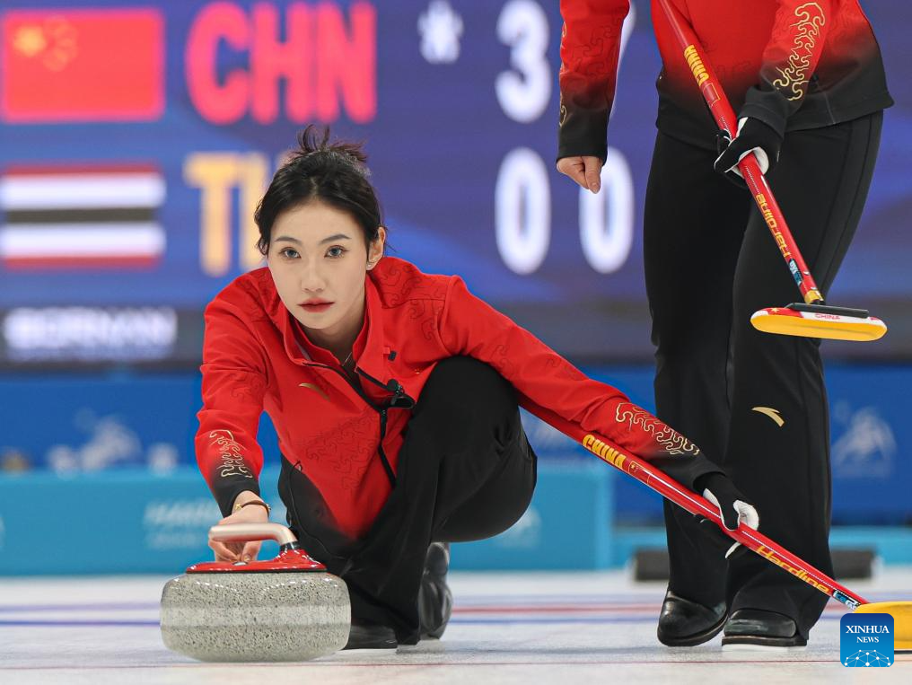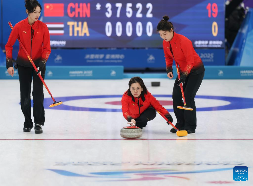Jiang Jiayi(C) of China competes during the Women's Round Robin Session 1 match between China and Thailand of the curling event at the 9th Asian Winter Games in Harbin, northeast China's Heilongjiang Province, Feb. 9, 2025. (Xinhua/Hu Xingyu)