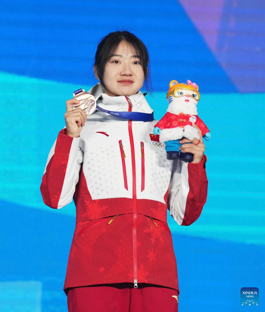 Bronze medalist Chi Chunxue of China poses during the awarding ceremony after the Cross-Country Skiing women's 5km free match at the 9th Asian Winter Games in Yabuli, northeast China's Heilongjiang Province, Feb. 9, 2025. (Xinhua/Wang Song)