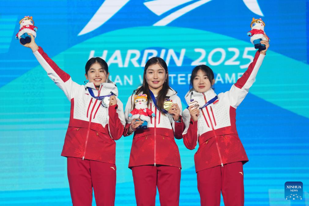 Gold medalist Bayani Jialin (C) of China, silver medalist Dinigeer Yilamujiang (L) of China and bronze medalist Chi Chunxue of China pose during the awarding ceremony after the Cross-Country Skiing women's 5km free match at the 9th Asian Winter Games in Yabuli, northeast China's Heilongjiang Province, Feb. 9, 2025. (Xinhua/Wang Song)