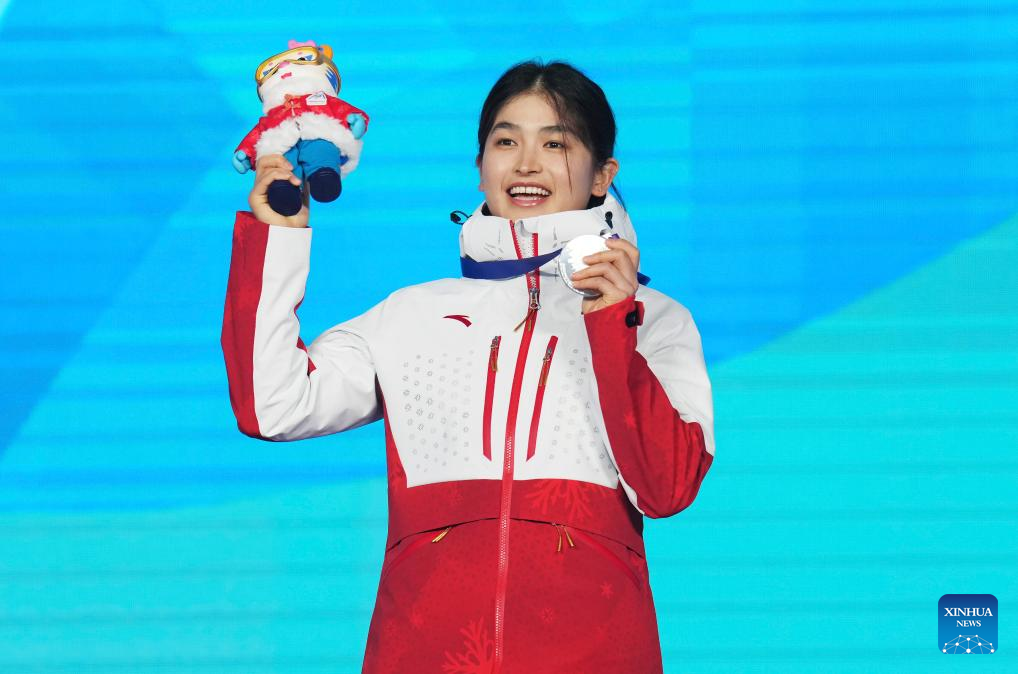 Silver medalist Dinigeer Yilamujiang of China poses during the awarding ceremony after the Cross-Country Skiing women's 5km free match at the 9th Asian Winter Games in Yabuli, northeast China's Heilongjiang Province, Feb. 9, 2025. (Xinhua/Wang Song)