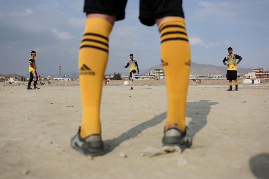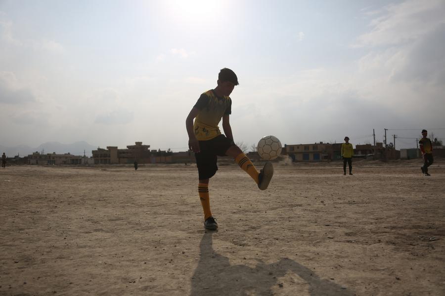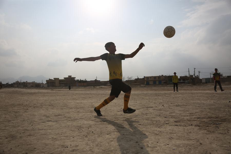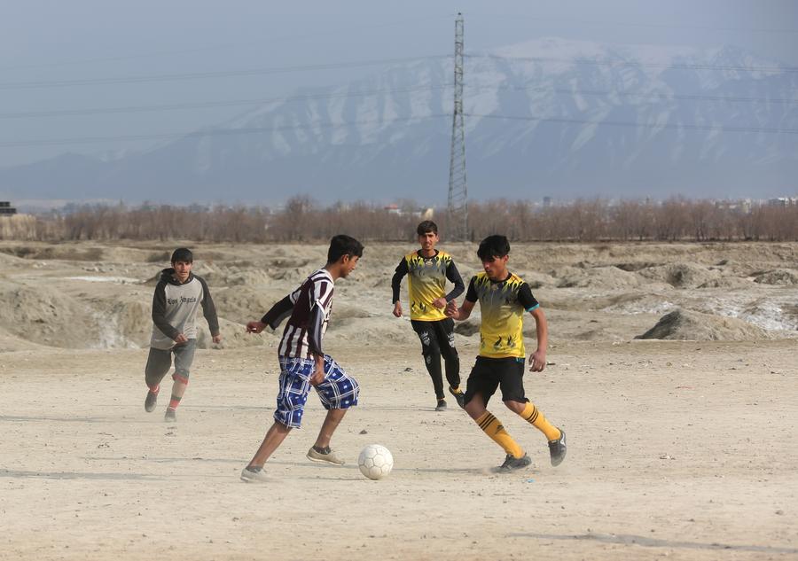 KABUL, Feb. 10 (Xinhua) -- A group of Afghan teenagers are playing football on a dry field in Kabul, the capital of Afghanistan. Limited sports facilities don't stop them from training regularly every week.