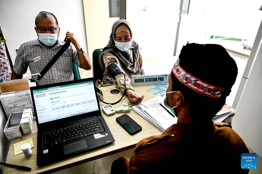 A woman undergoes a health screening on the first day of the Free Health Check (CKG) program at Ciater Community Health Center in South Tangerang, Banten Province, Indonesia, Feb. 10, 2025. Indonesia launched the Free Health Check (CKG) program on Monday as a national initiative to improve public health quality and reduce preventable diseases. (Xinhua/Agung Kuncahya B.)