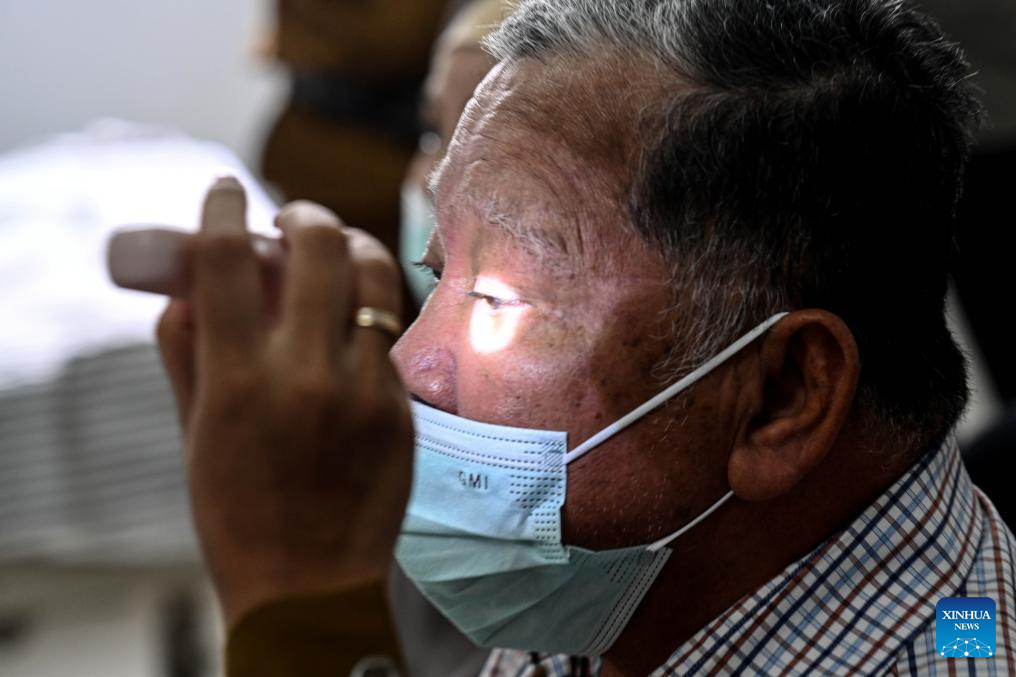 A medical worker offers an ophthalmological checkup to an elderly man during the Free Health Check (CKG) program at Ciater Community Health Center in South Tangerang, Banten Province, Indonesia, Feb. 10, 2025. Indonesia launched the Free Health Check (CKG) program on Monday as a national initiative to improve public health quality and reduce preventable diseases. (Xinhua/Agung Kuncahya B.)