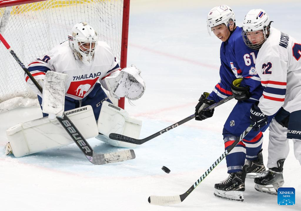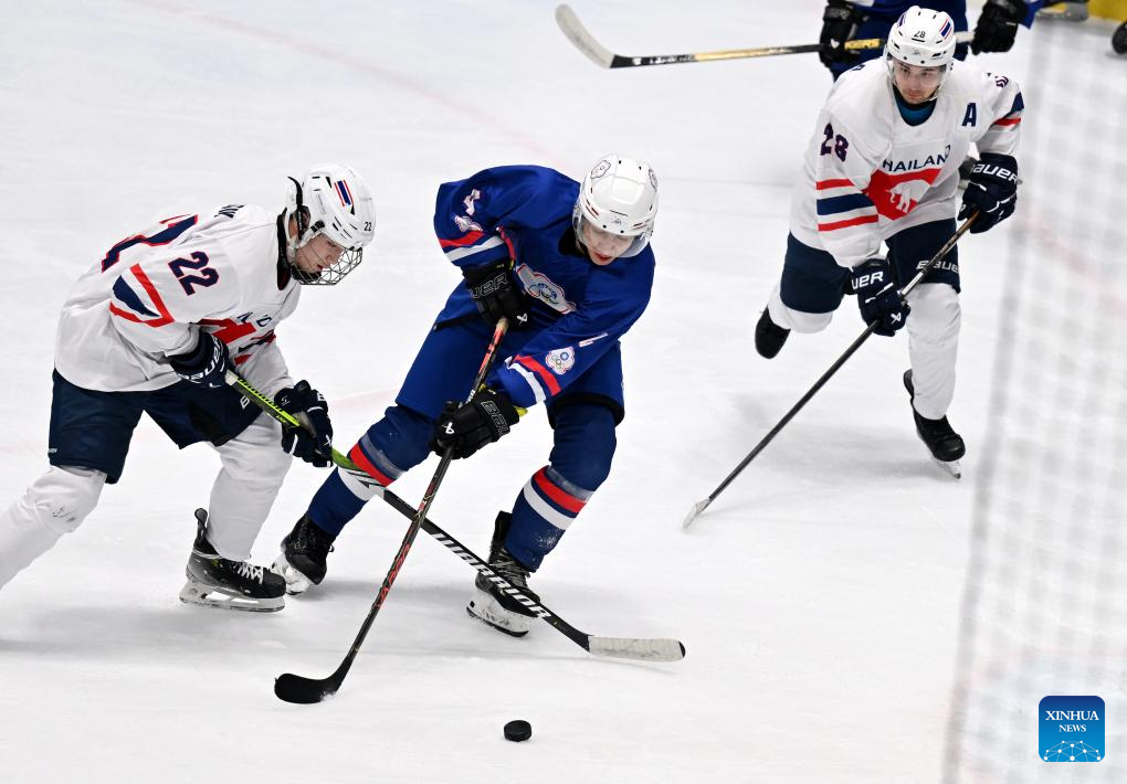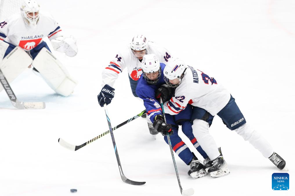 Chanokchon Limpinphet (3rd R) of Thailand shoots during the men's ice hockey group A match between Chinese Taipei and Thailand at the 9th Asian Winter Games in Harbin, northeast China's Heilongjiang Province, Feb. 10, 2025. (Xinhua/Li Ziheng)