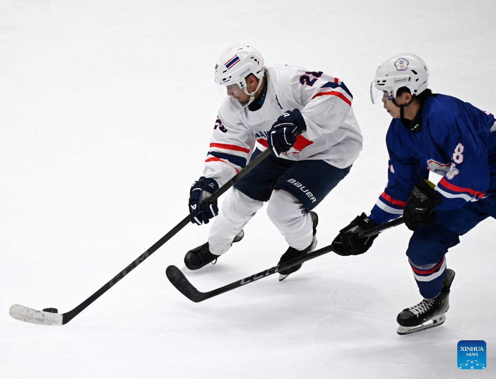 Kim Aarola (L) of Thailand vies with Lin Yo-Chen of Chinese Taipei during the men's ice hockey group A match between Chinese Taipei and Thailand at the 9th Asian Winter Games in Harbin, northeast China's Heilongjiang Province, Feb. 10, 2025. (Xinhua/Li Jianan)