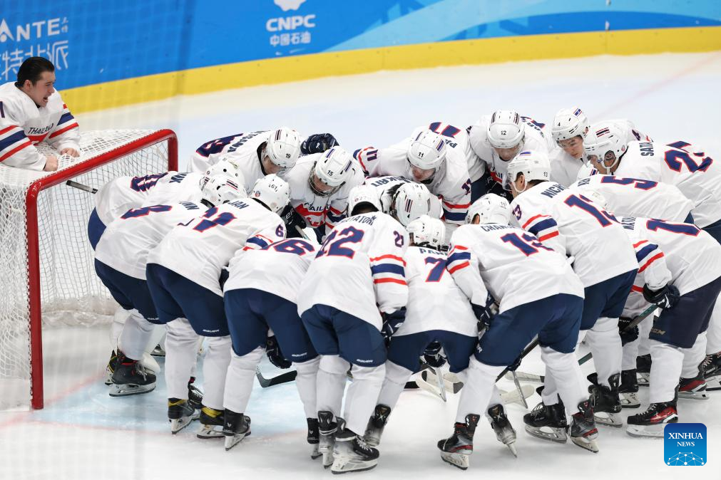 Players of Thailand cheer before the men's ice hockey group A match between Chinese Taipei and Thailand at the 9th Asian Winter Games in Harbin, northeast China's Heilongjiang Province, Feb. 10, 2025. (Xinhua/Zhang Tao)
