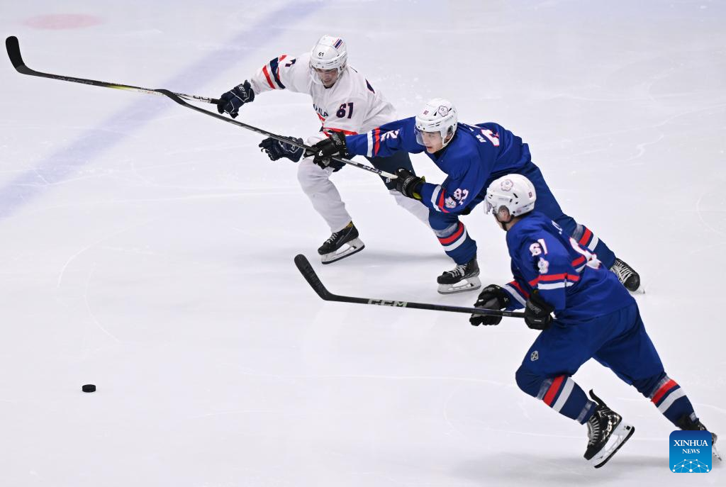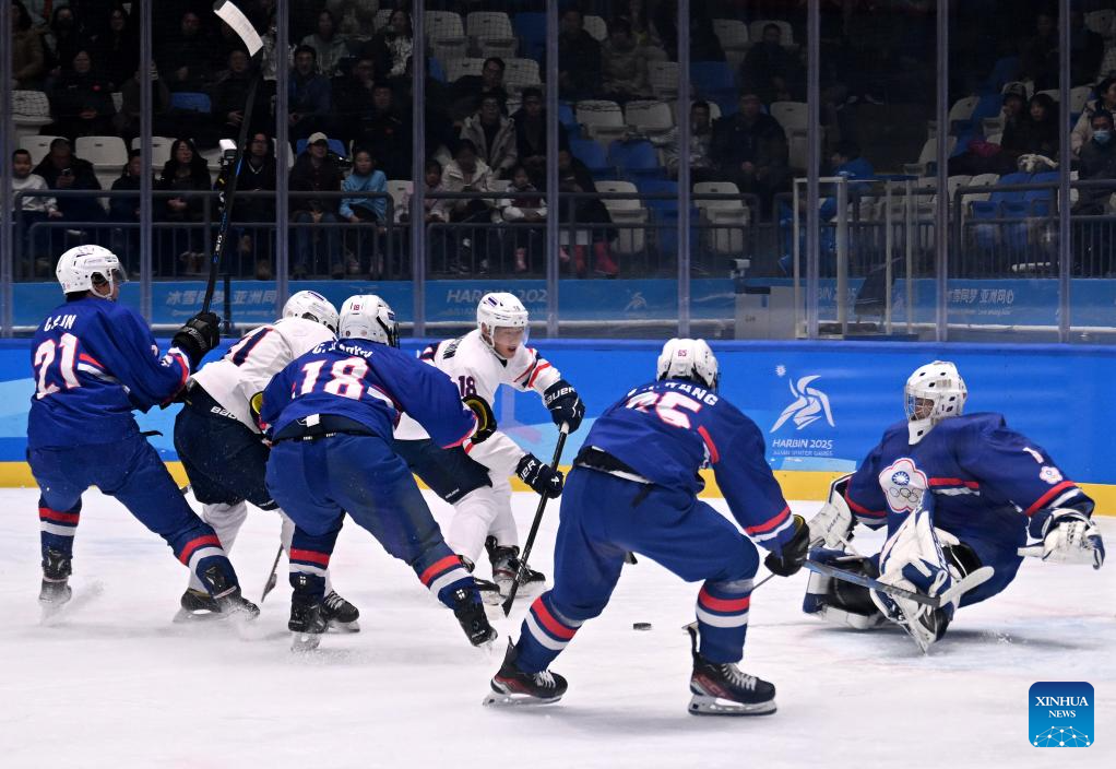 Lin Yi-Kuan (front C) of Chinese Taipei competes during the men's ice hockey group A match between Chinese Taipei and Thailand at the 9th Asian Winter Games in Harbin, northeast China's Heilongjiang Province, Feb. 10, 2025. (Xinhua/Zhang Tao)