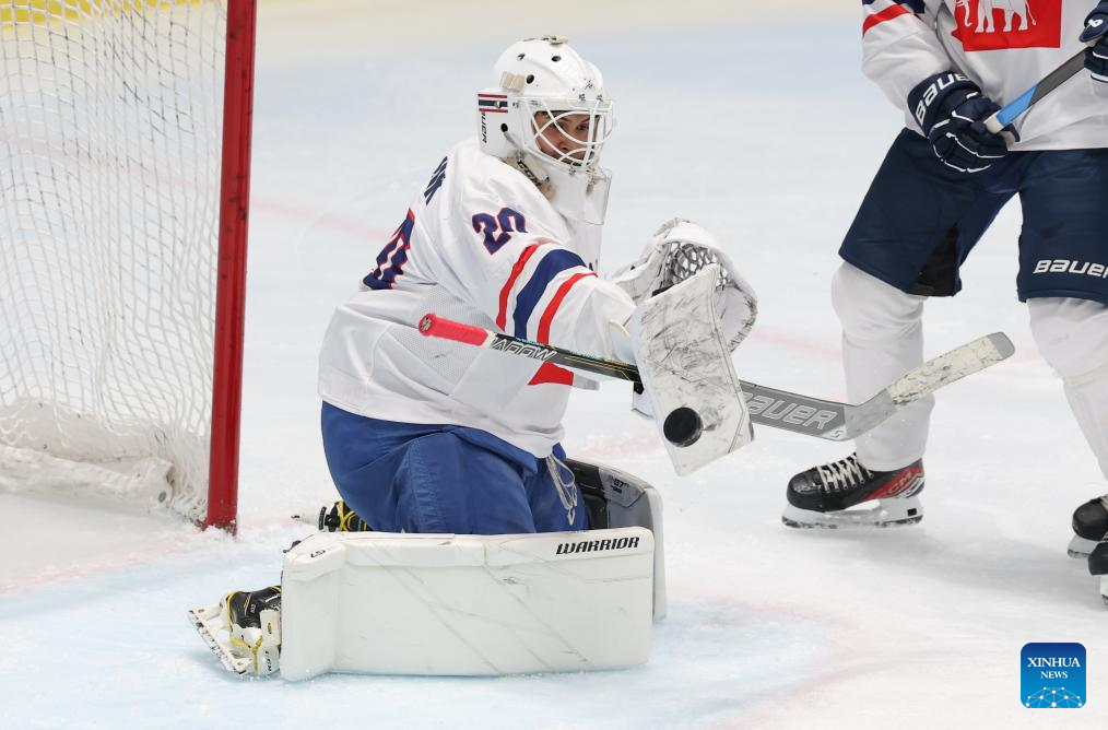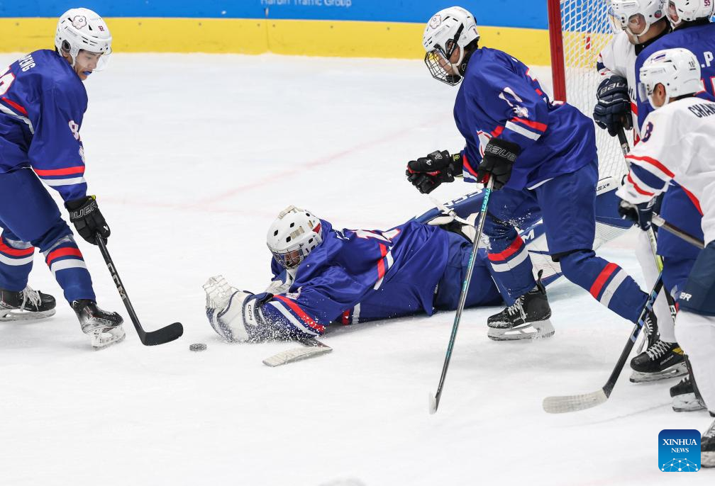 Goalkeeper of Chinese Taipei Lee Yi-Cheng (2nd L) tries to make a save during the men's ice hockey group A match between Chinese Taipei and Thailand at the 9th Asian Winter Games in Harbin, northeast China's Heilongjiang Province, Feb. 10, 2025. (Xinhua/Yang Lei)