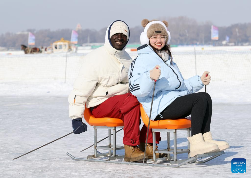 Paul Kofei (R) from Cote d'Ivoire has fun with his friend at the Harbin Songhua River Ice and Snow Carnival in Harbin, northeast China's Heilongjiang Province, Feb. 9, 2025. With the 9th Asian Winter Games underway, Harbin is attracting numerous domestic and international visitors to enjoy the beauty of winter scenery. (Xinhua/Hou Jun)