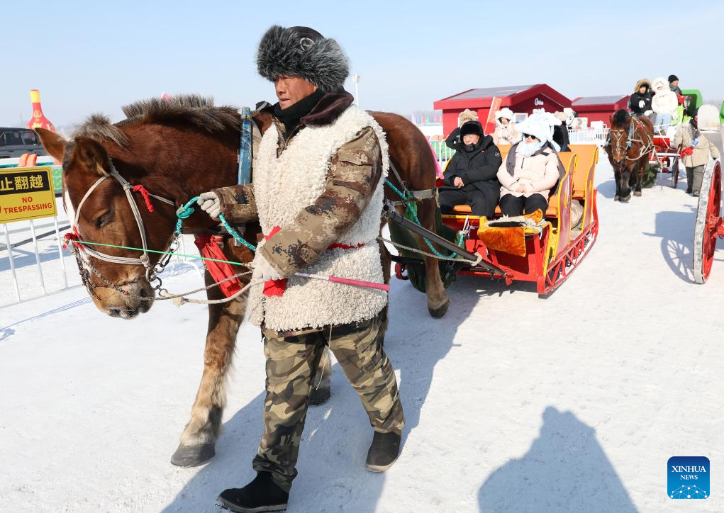 Tourists have fun at the Harbin Songhua River Ice and Snow Carnival in Harbin, northeast China's Heilongjiang Province, Feb. 9, 2025. With the 9th Asian Winter Games underway, Harbin is attracting numerous domestic and international visitors to enjoy the beauty of winter scenery. (Xinhua/Hou Jun)