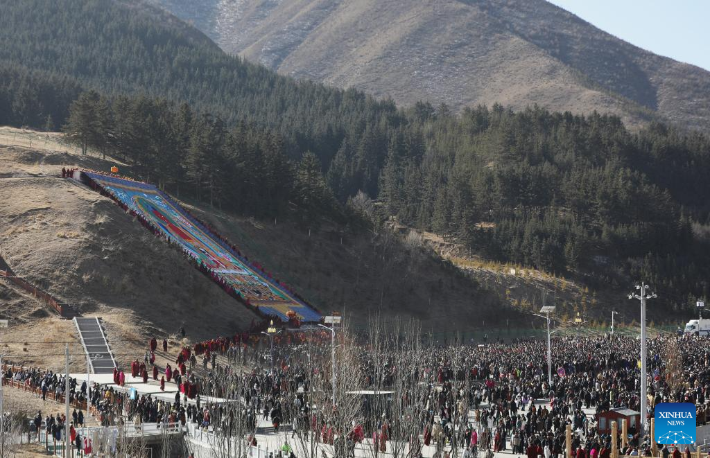 Monks carry a huge Thangka painting bearing the image of the Buddha during the annual "sunning of the Buddha" ceremony of Labrang Monastery in Xiahe County, northwest China's Gansu Province, Feb. 10, 2025. Believers and tourists from home and abroad attended a grand Tibetan Buddhist event, known as the "sunning of the Buddha" ceremony, held Monday at the Labrang Monastery in northwest China's Gansu Province.