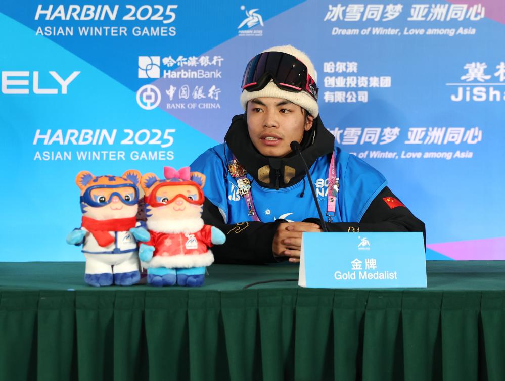 Gold medalist Yang Wenlong of China attends the press conference after the men's snowboard big air final match at the 9th Asian Winter Games in Yabuli, northeast China's Heilongjiang Province, Feb. 10, 2025. (Xinhua/Zhang Chenlin)