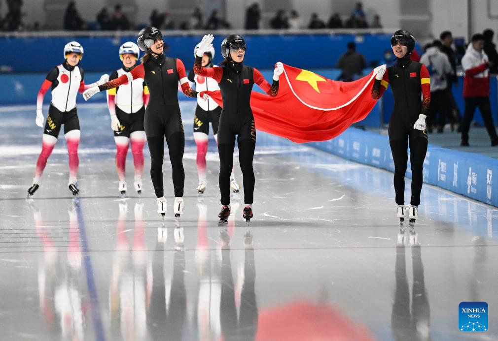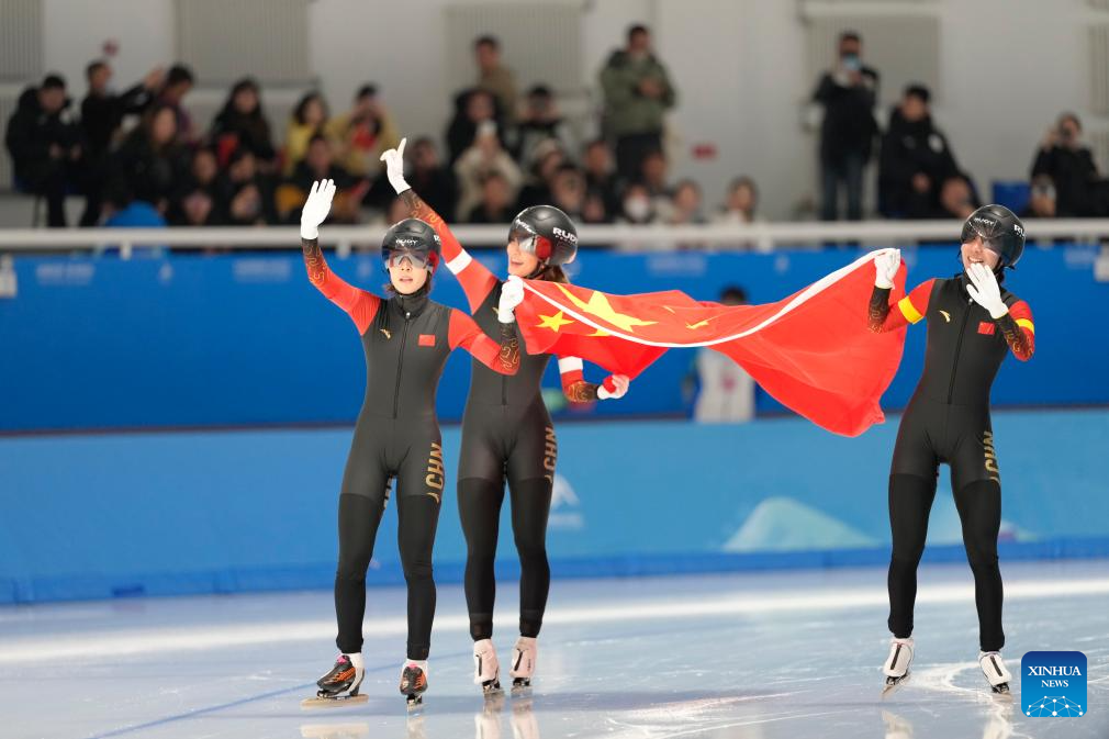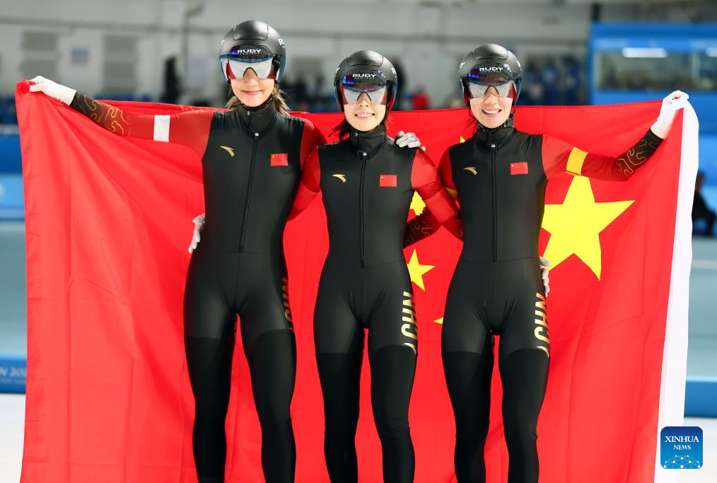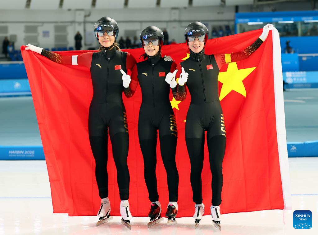 Yang Binyu (L, front), Ahenaer Adake (C, front) and Han Mei (R, front) of China celebrate after the women's team pursuit of the speed skating event at the 9th Asian Winter Games in Harbin, northeast China's Heilongjiang Province, Feb. 11, 2025. (Xinhua/Chen Zhenhai)