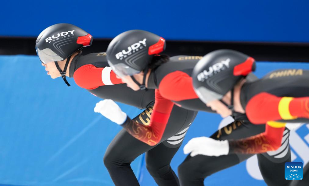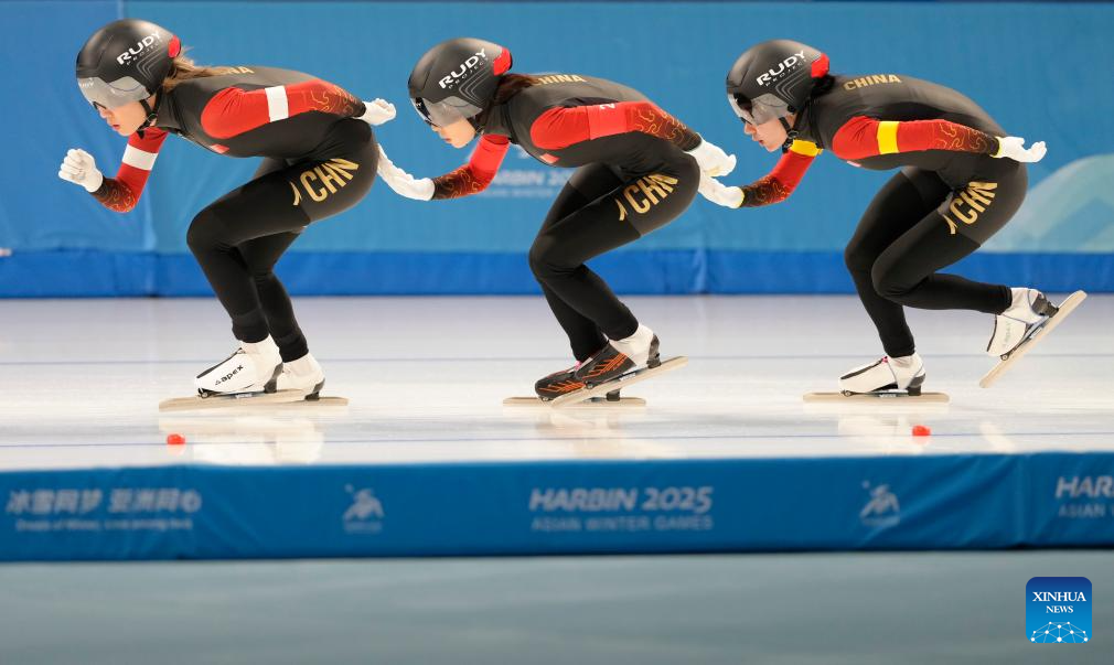 Yang Binyu (L), Ahenaer Adake (C) and Han Mei of China compete during the women's team pursuit of the speed skating event at the 9th Asian Winter Games in Harbin, northeast China's Heilongjiang Province, Feb. 11, 2025. (Xinhua/Wang Jianwei)