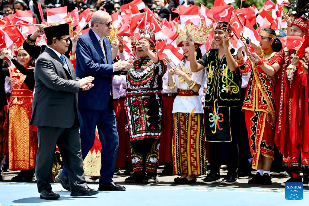 Indonesian President Prabowo Subianto (L) and Turkish President Recep Tayyip Erdogan greet students during a welcome ceremony at the Bogor Presidential Palace in Bogor, West Java, Indonesia, Feb. 12, 2025. Recep Tayyip Erdogan arrived on Tuesday evening at Halim Perdanakusuma Military Airport in Jakarta for a state visit from Tuesday to Wednesday. (Presidential State Press Bureau/Handout via Xinhua)