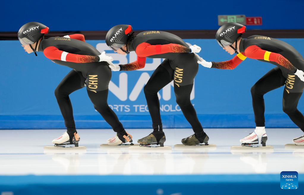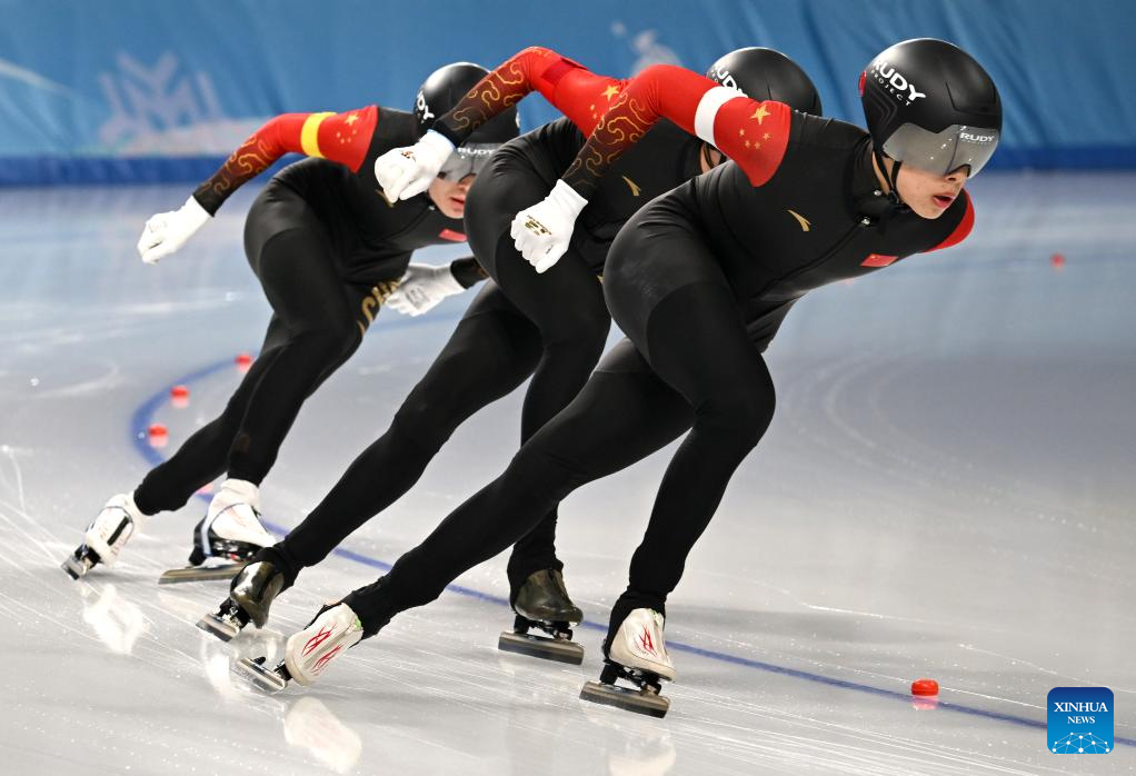 Team China competes during the men's team pursuit of the speed skating event at the 9th Asian Winter Games in Harbin, northeast China's Heilongjiang Province, Feb. 11, 2025. (Xinhua/Li Yibo)