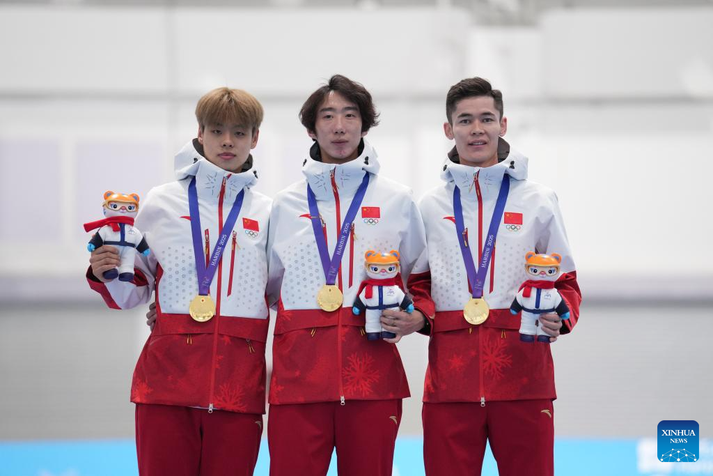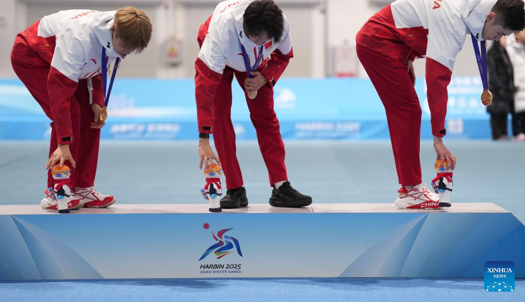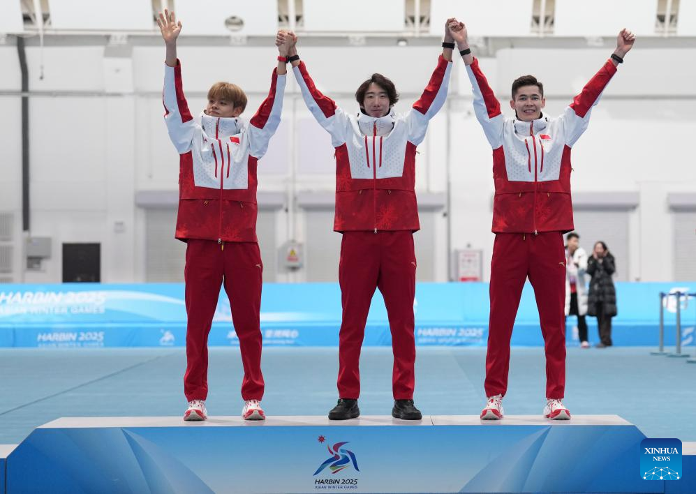 Gold medalists Liu Hanbin (L), Wu Yu (C) and Hanahati Muhamaiti of China attend the awarding cereomy after the men's team pursuit of the speed skating event at the 9th Asian Winter Games in Harbin, northeast China's Heilongjiang Province, Feb. 11, 2025. (Xinhua/Li Yibo)
