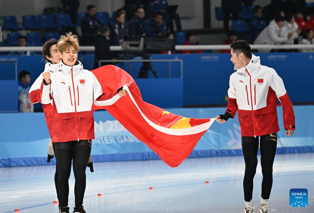 Liu Hanbin (L, front), Wu Yu and Hanahati Muhamaiti (R) of China celebrate after the men's team pursuit of the speed skating event at the 9th Asian Winter Games in Harbin, northeast China's Heilongjiang Province, Feb. 11, 2025. (Xinhua/Wang Xi)