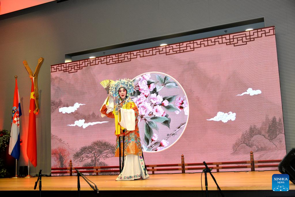 A Chinese artist performs during the "Happy Spring Festival" celebration in Zagreb, Croatia, on Feb. 10, 2025. The "Happy Spring Festival" performance by an arts troupe from central China's Hubei Province captivated audiences at the Zagreb School of Economics and Management (ZSEM) in the Croatian capital on Monday. (Xinhua/Li Xuejun)