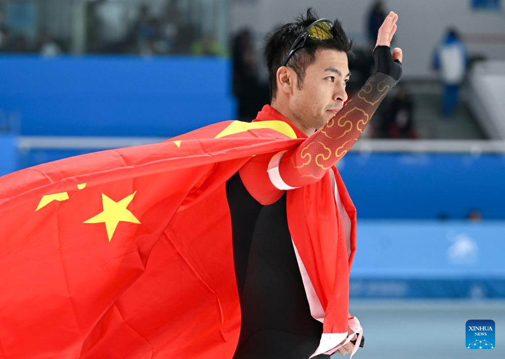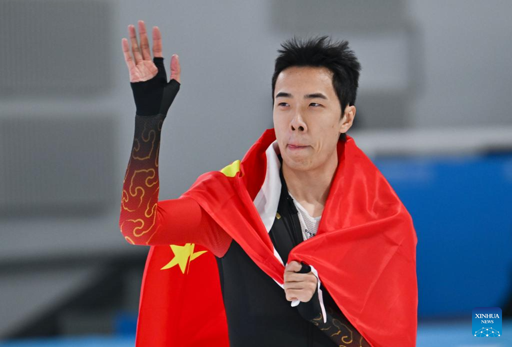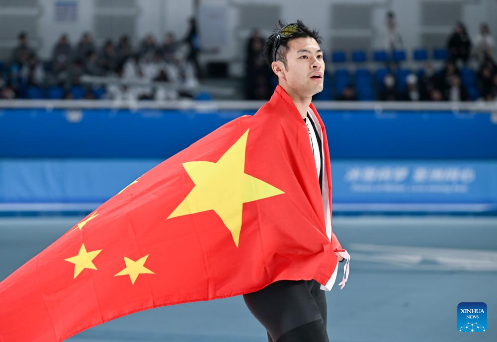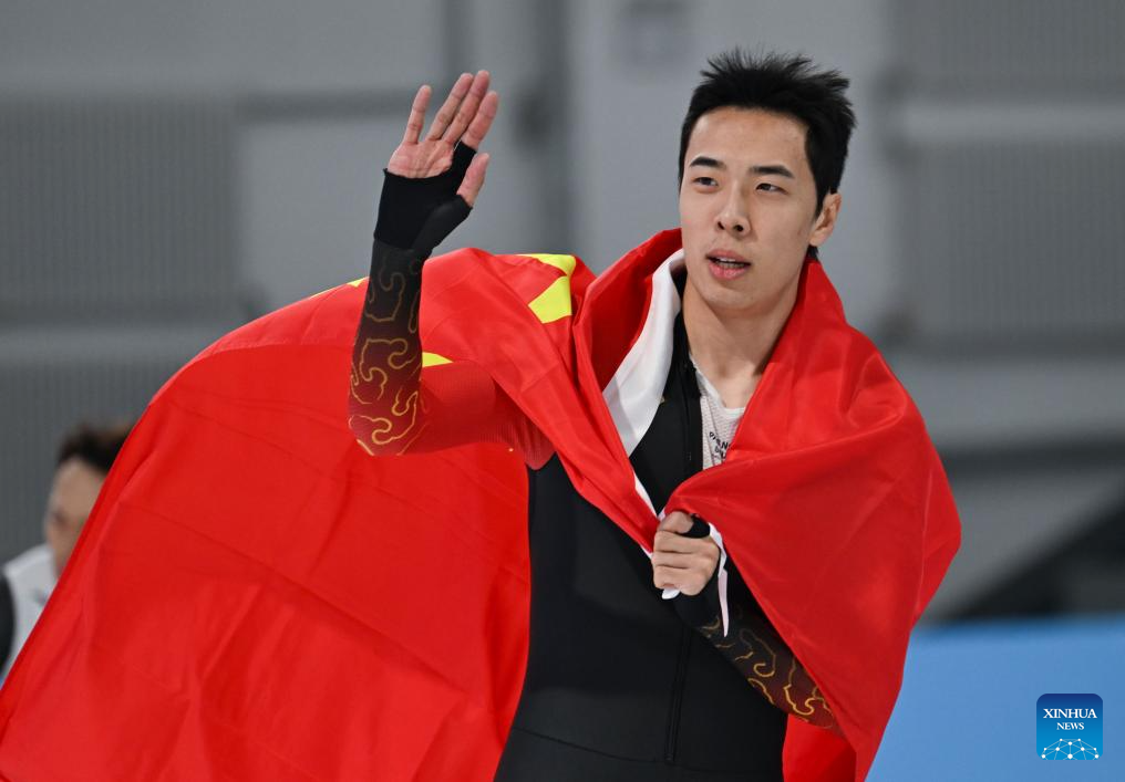 Ning Zhongyan of China celebrates after the men's 1000m final match of the speed skating event at the 9th Asian Winter Games in Harbin, northeast China's Heilongjiang Province, Feb. 11, 2025. (Xinhua/Wang Xi)