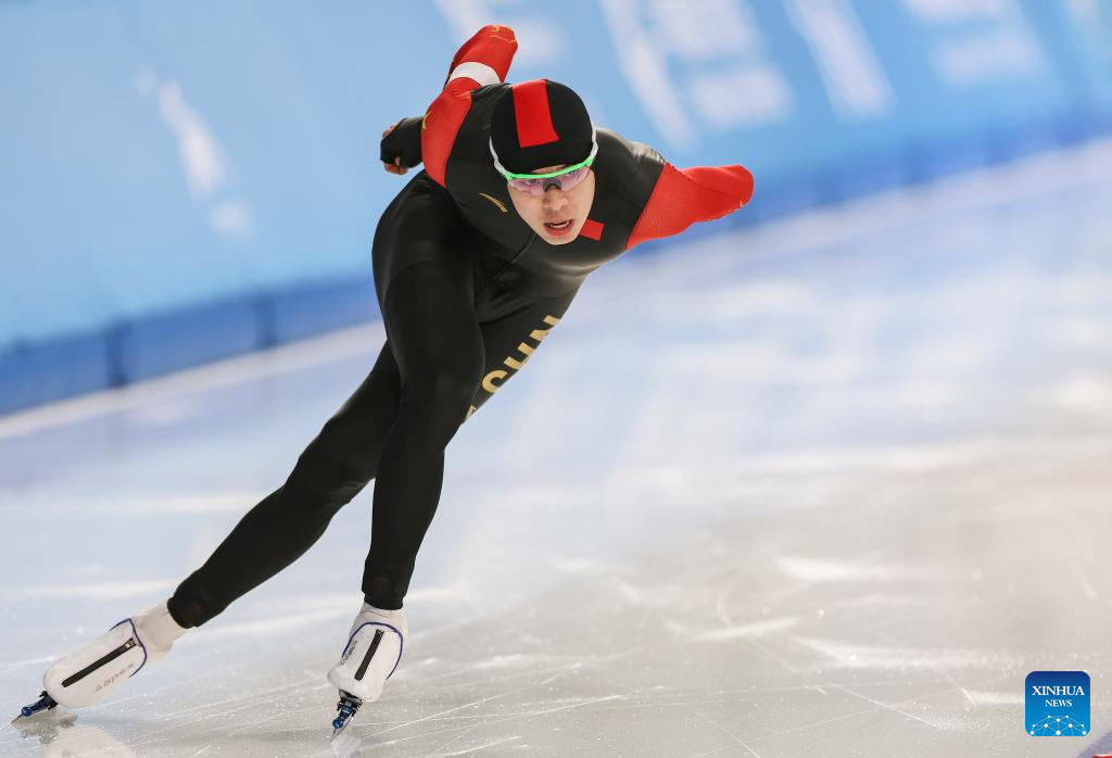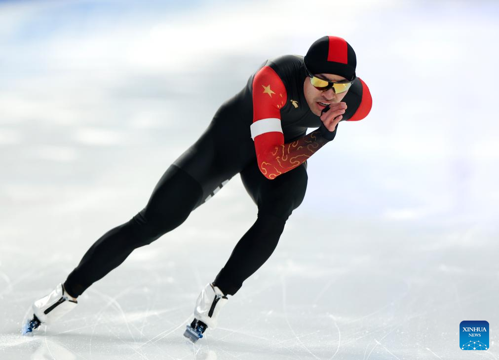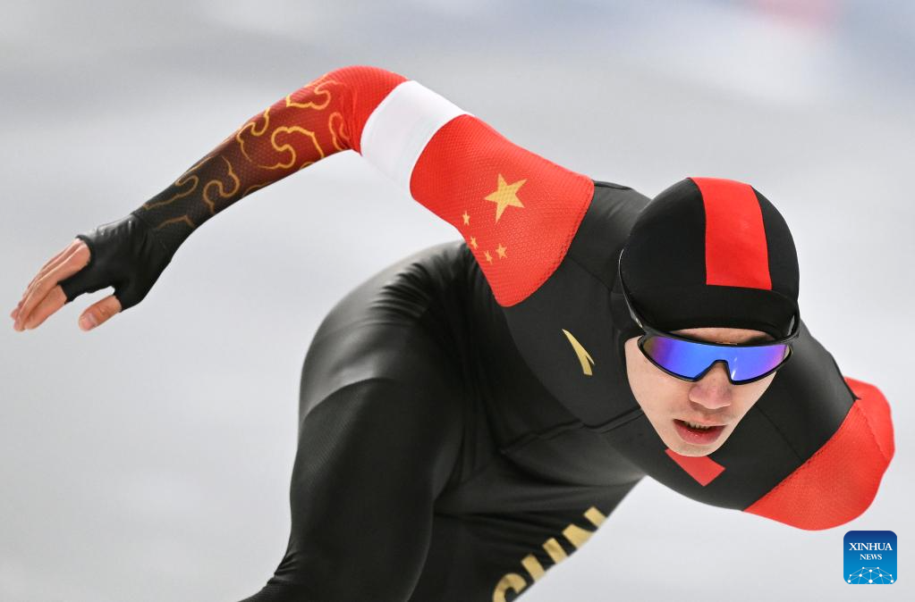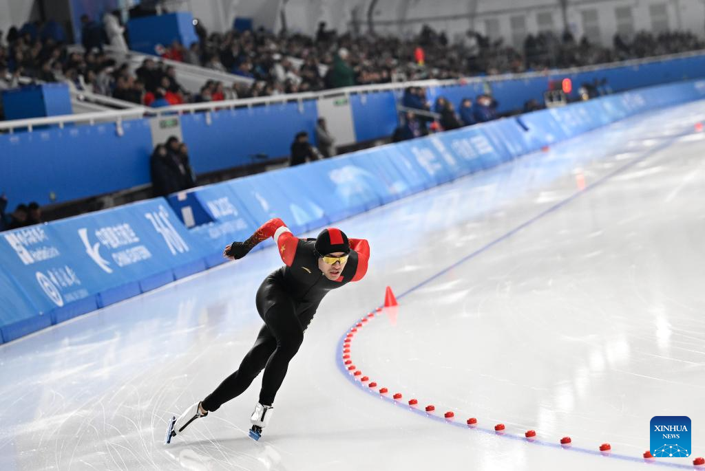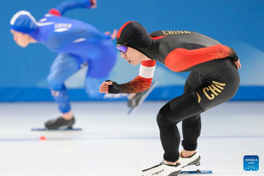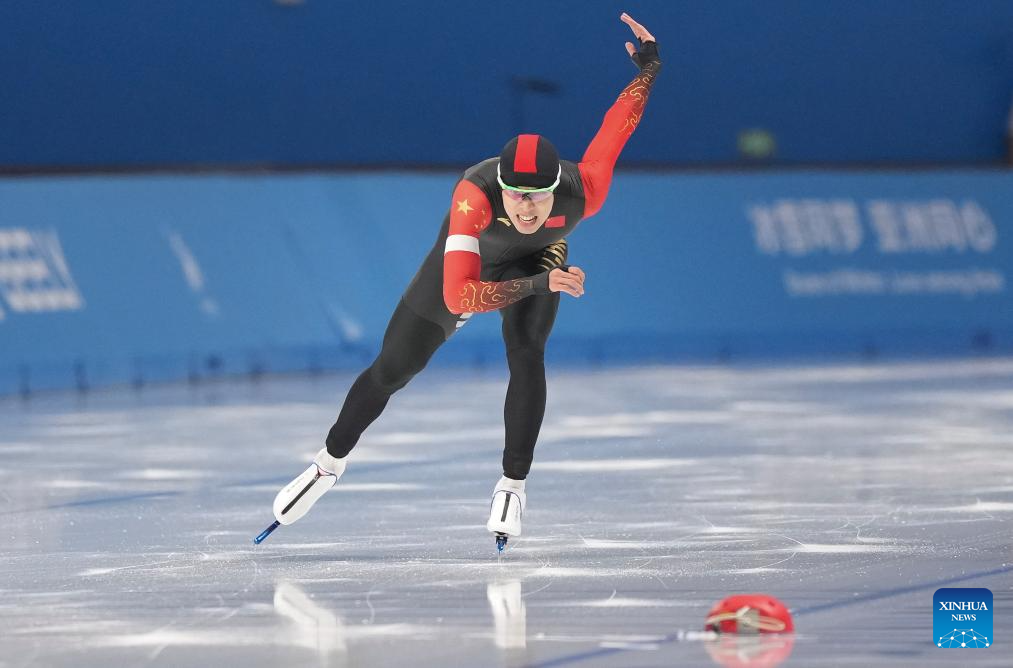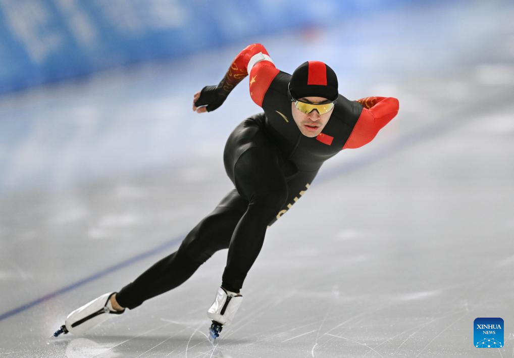 Lian Ziwen of China competes during the men's 1000m final match of the speed skating event at the 9th Asian Winter Games in Harbin, northeast China's Heilongjiang Province, Feb. 11, 2025. (Xinhua/Wang Jianwei)