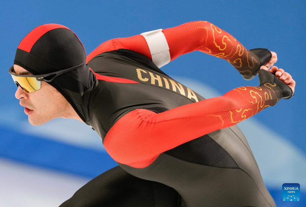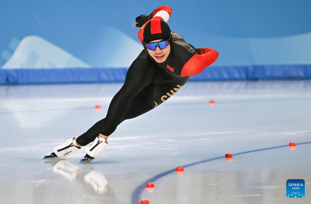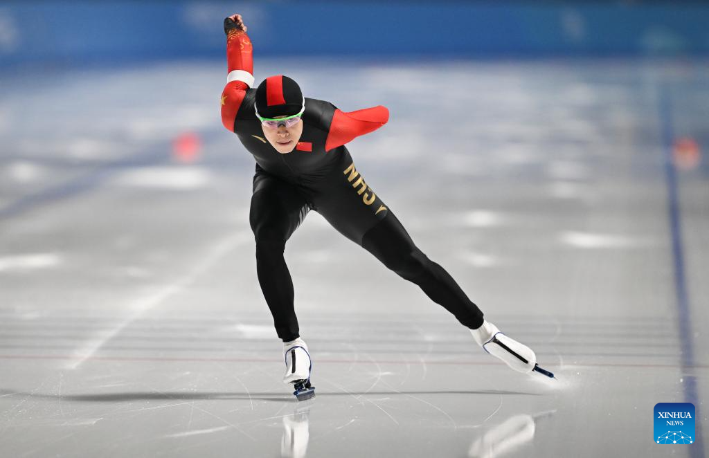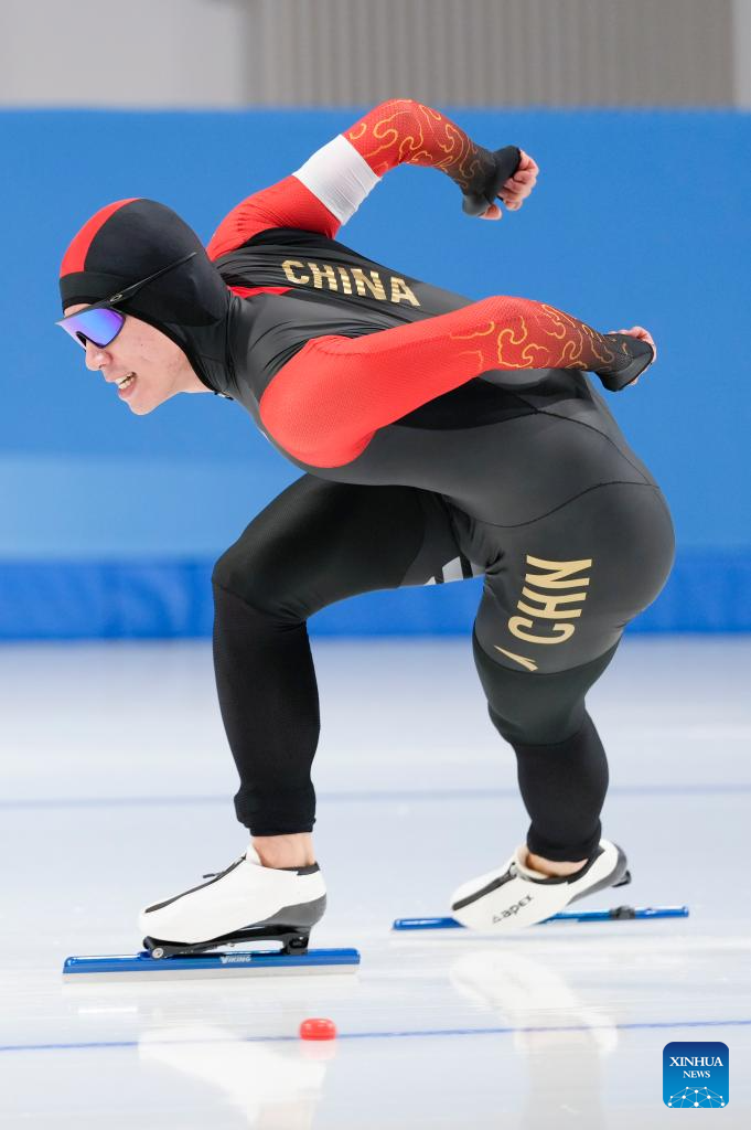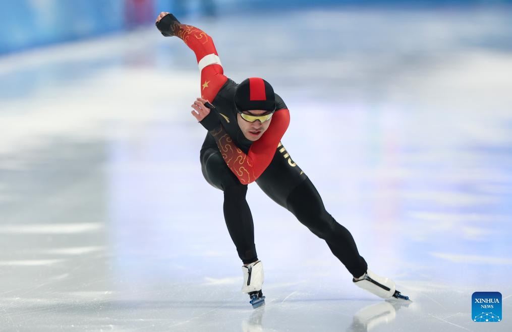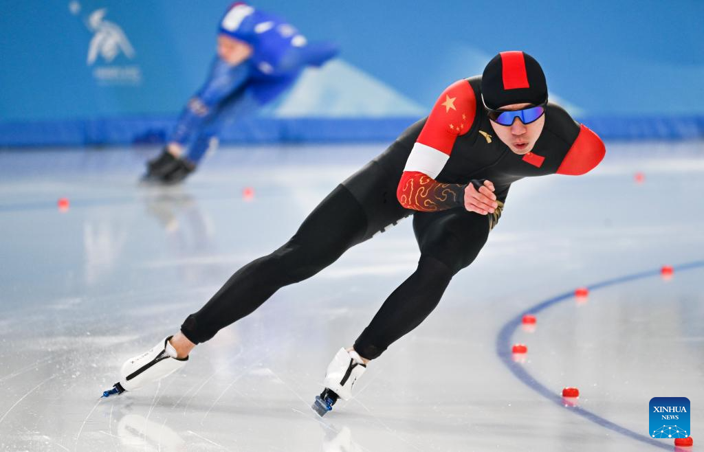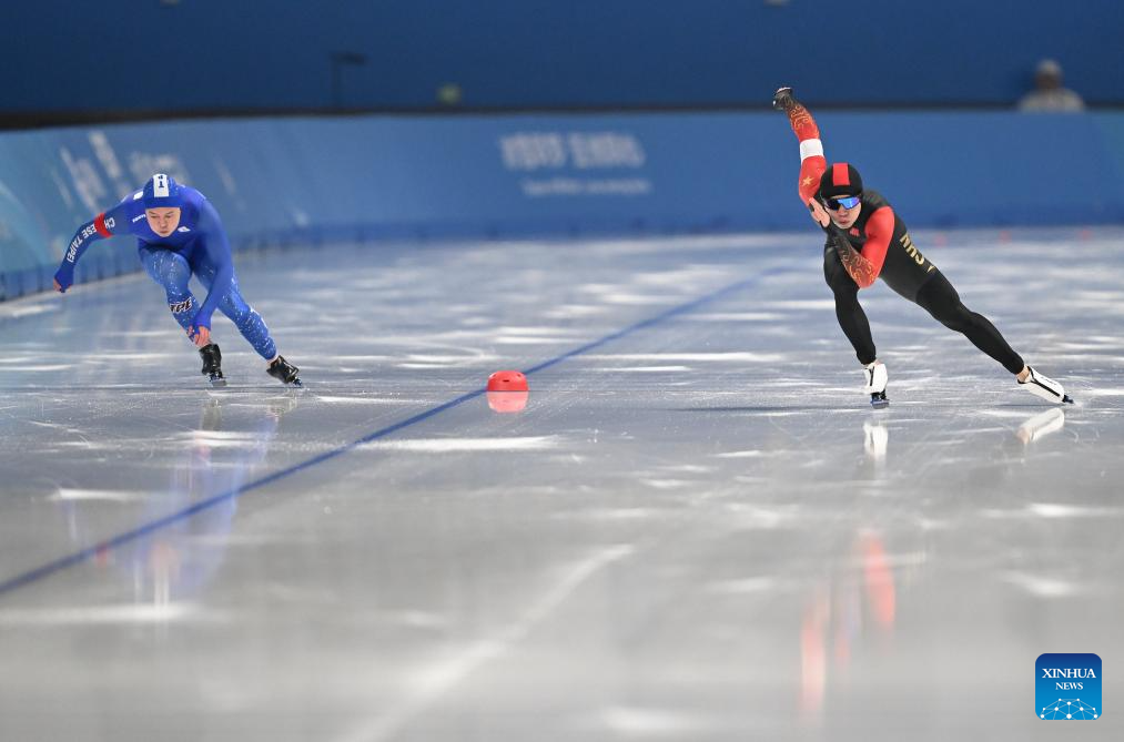 Lian Ziwen of China competes during the men's 1000m final match of the speed skating event at the 9th Asian Winter Games in Harbin, northeast China's Heilongjiang Province, Feb. 11, 2025. (Xinhua/Wang Jianwei)