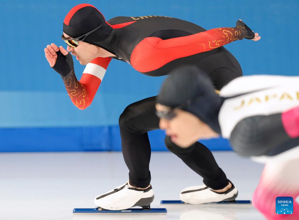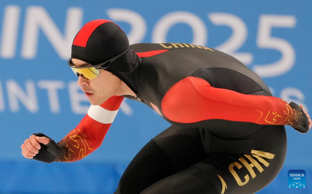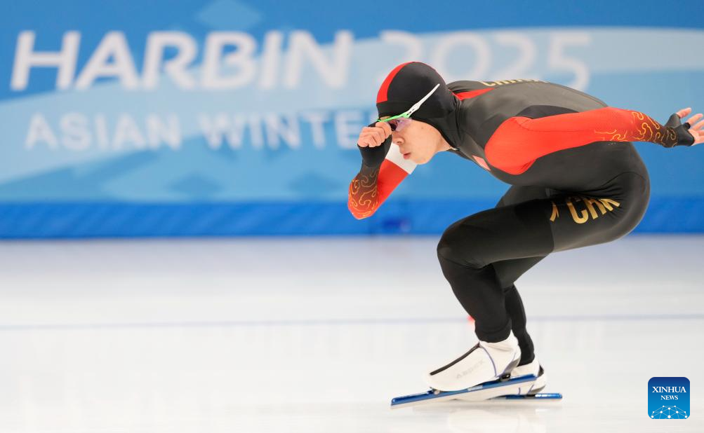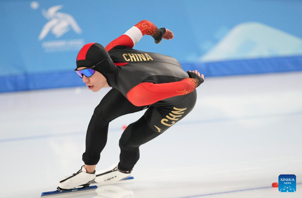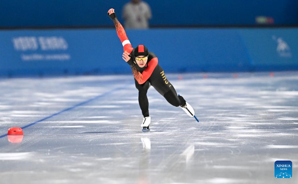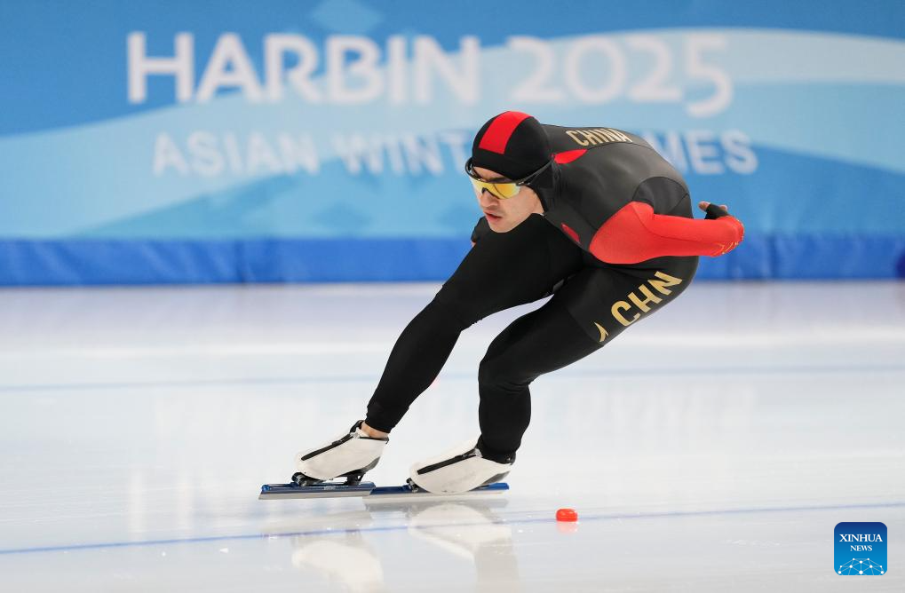 Lian Ziwen of China competes during the men's 1000m final match of the speed skating event at the 9th Asian Winter Games in Harbin, northeast China's Heilongjiang Province, Feb. 11, 2025. (Xinhua/Li Yibo)