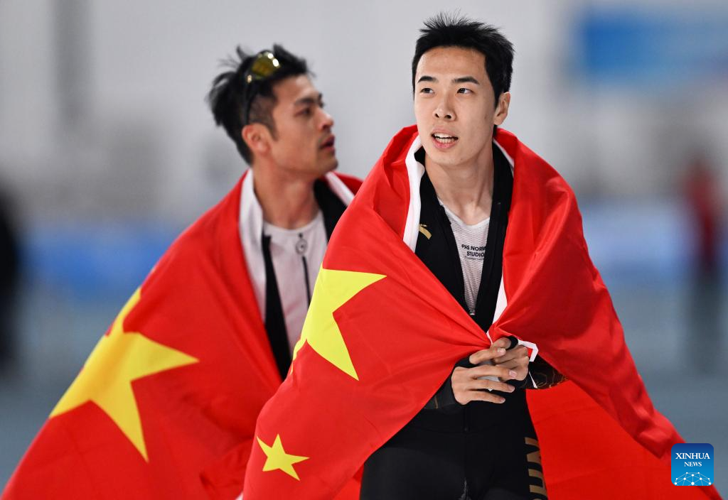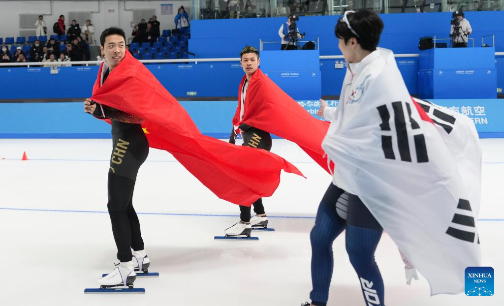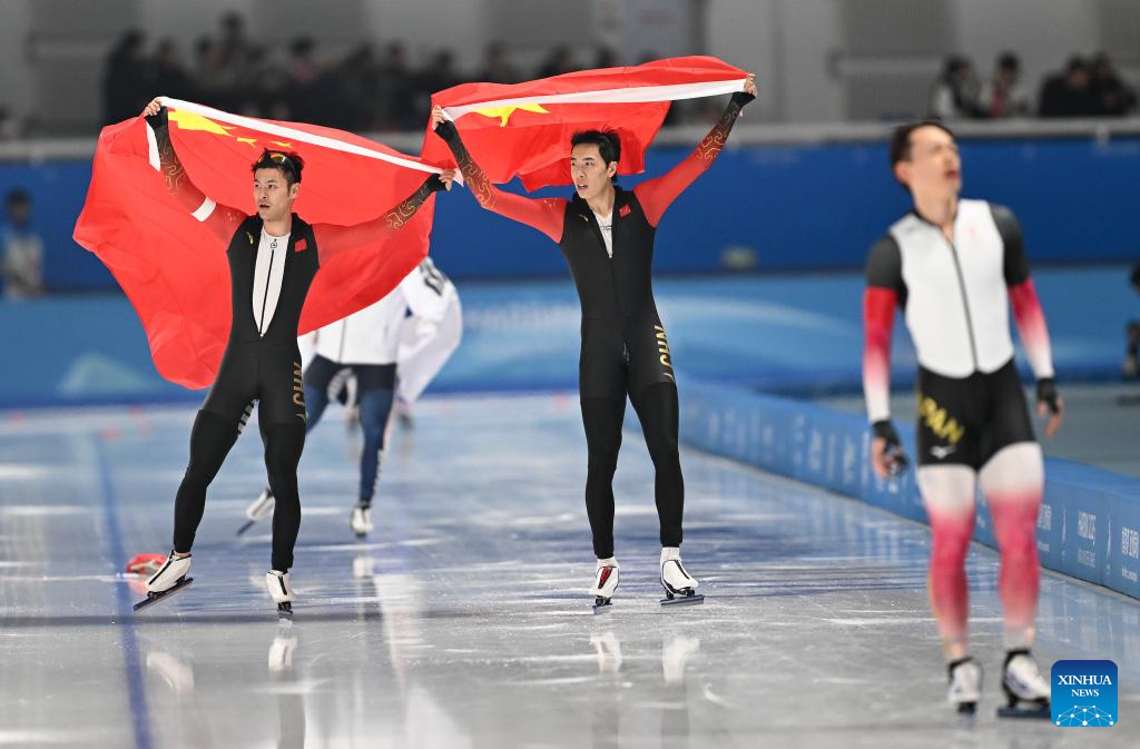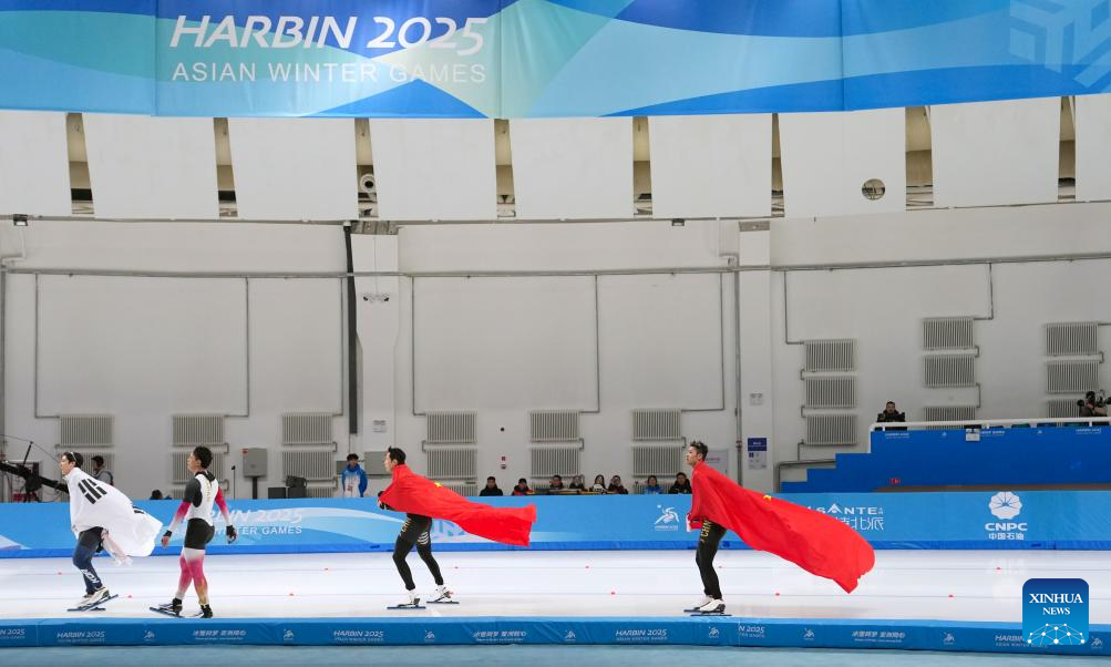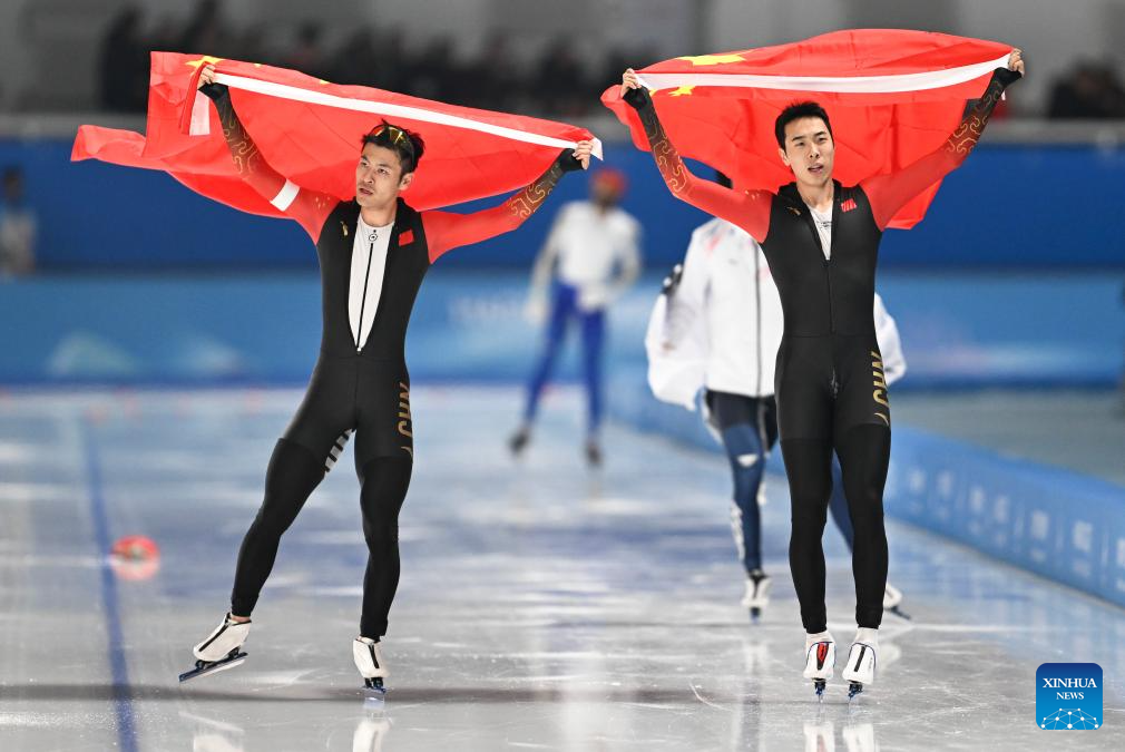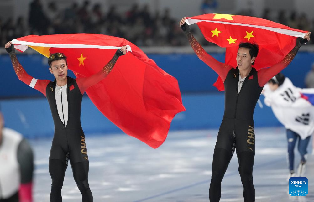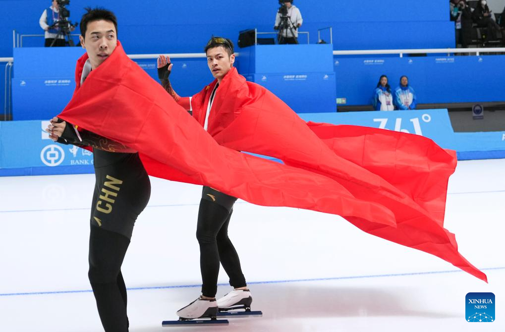 Ning Zhongyan (1st R) and Lian Ziwen (2nd R) of China celebrate after the men's 1000m final match of the speed skating event at the 9th Asian Winter Games in Harbin, northeast China's Heilongjiang Province, Feb. 11, 2025. (Xinhua/Li Yibo)