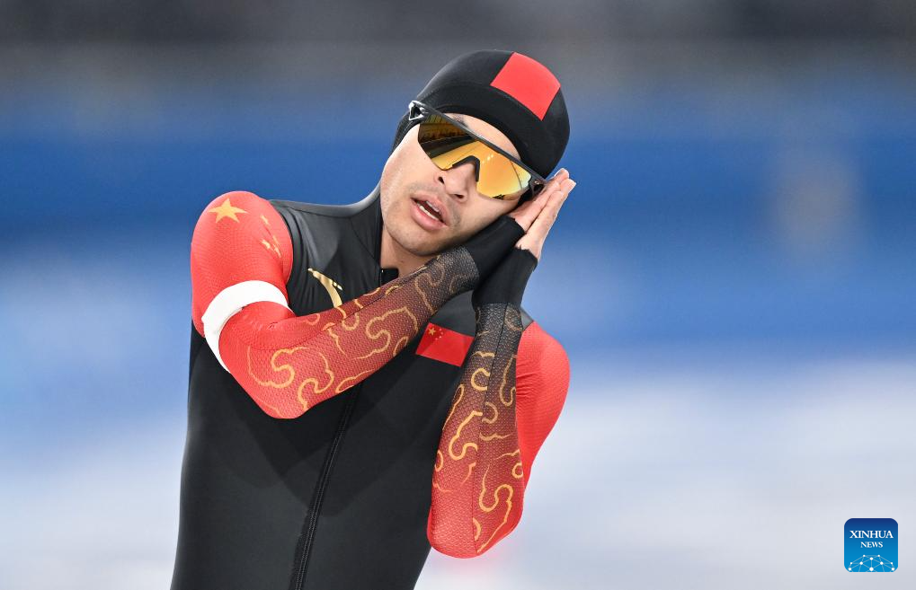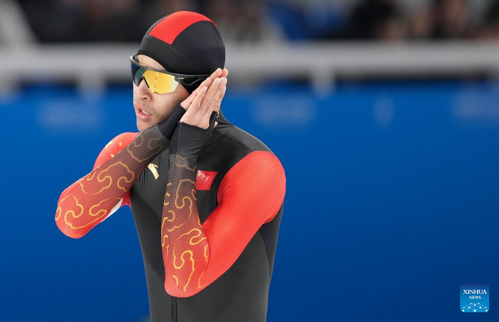 Ning Zhongyan of China reacts during the men's 1000m final match of the speed skating event at the 9th Asian Winter Games in Harbin, northeast China's Heilongjiang Province, Feb. 11, 2025. (Xinhua/Chen Zhenhai)