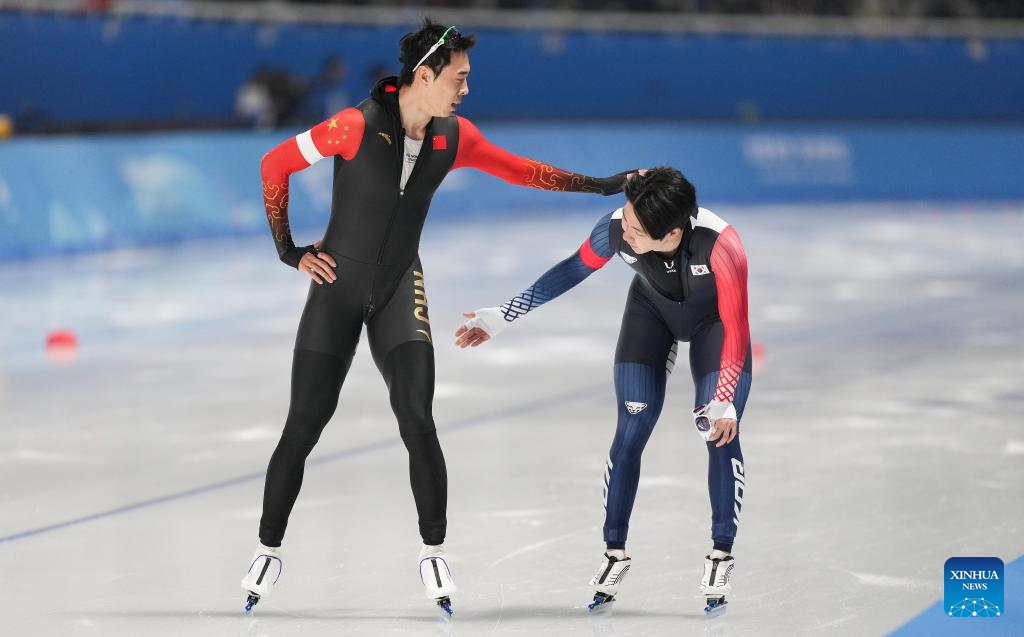 Lian Ziwen (L) of China reacts during the men's 1000m final match of the speed skating event at the 9th Asian Winter Games in Harbin, northeast China's Heilongjiang Province, Feb. 11, 2025. (Xinhua/Li Yibo)