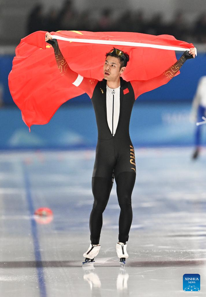 Ning Zhongyan of China celebrates during the men's 1000m final match of the speed skating event at the 9th Asian Winter Games in Harbin, northeast China's Heilongjiang Province, Feb. 11, 2025. (Xinhua/Chen Zhenhai)