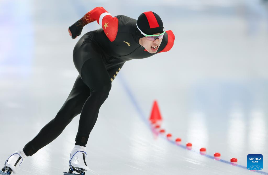 Lian Ziwen of China competes during the men's 1000m final match of the speed skating event at the 9th Asian Winter Games in Harbin, northeast China's Heilongjiang Province, Feb. 11, 2025. (Xinhua/Wang Kaiyan)