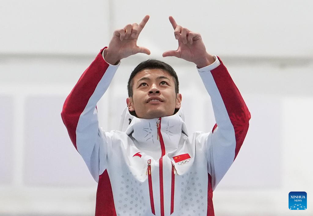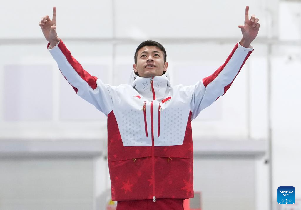 Ning Zhongyan of China celebrates after the men's 1000m final match of the speed skating event at the 9th Asian Winter Games in Harbin, northeast China's Heilongjiang Province, Feb. 11, 2025. (Xinhua/Wang Kaiyan)