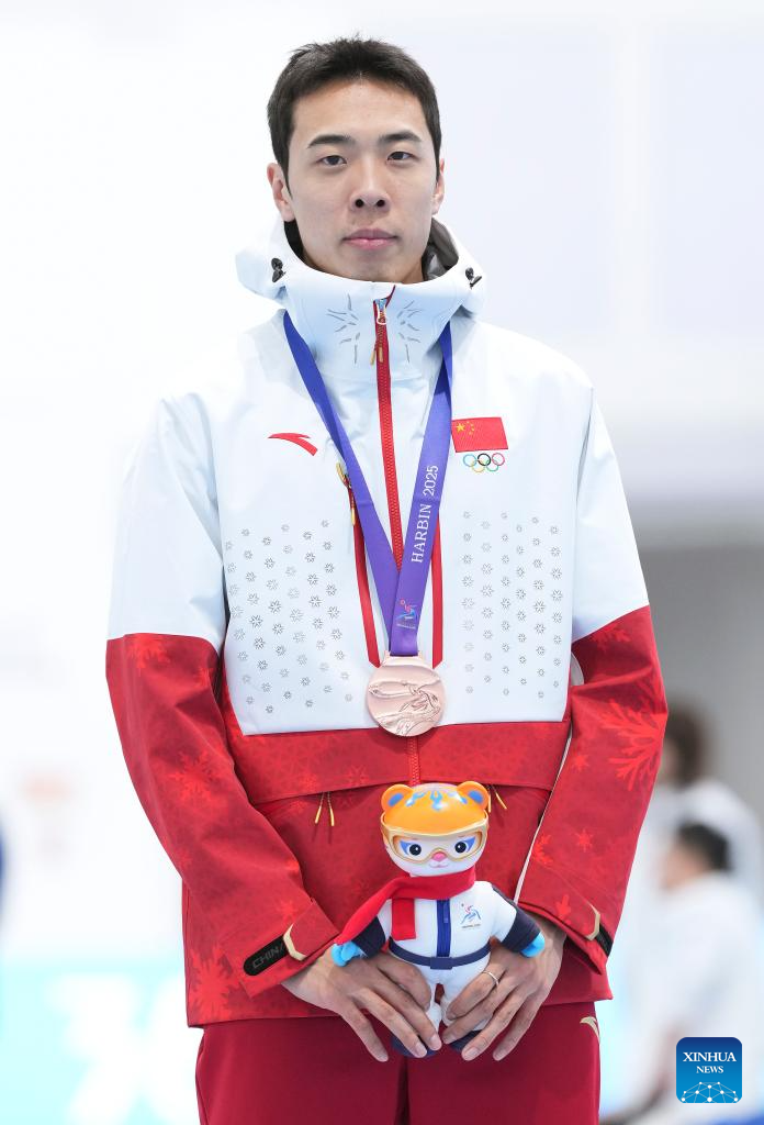 Bronze medalist Lian Ziwen of China poses during the awarding ceremony after the men's 1000m final match of the speed skating event at the 9th Asian Winter Games in Harbin, northeast China's Heilongjiang Province, Feb. 11, 2025. (Xinhua/Li Yibo)