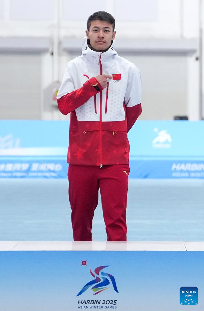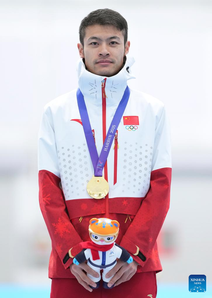 Gold medalist Ning Zhongyan of China poses during the awarding ceremony after the men's 1000m final match of the speed skating event at the 9th Asian Winter Games in Harbin, northeast China's Heilongjiang Province, Feb. 11, 2025. (Xinhua/Li Yibo)