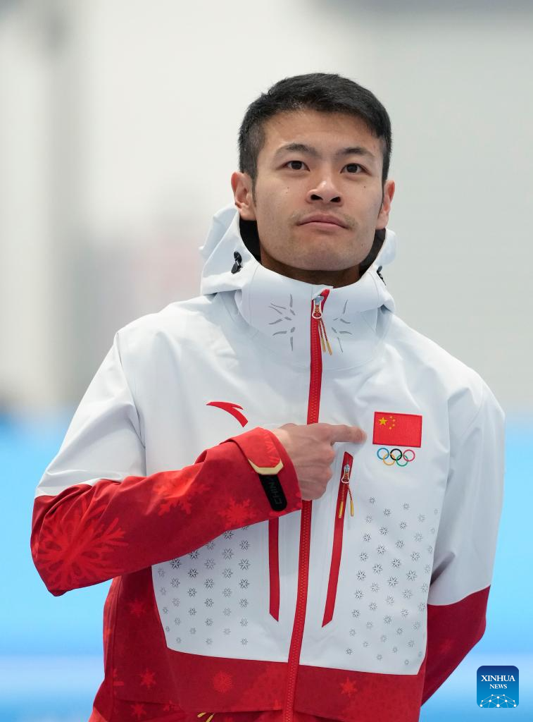 Ning Zhongyan of China celebrates during the awarding ceremony of the men's 1000m final match of the speed skating event at the 9th Asian Winter Games in Harbin, northeast China's Heilongjiang Province, Feb. 11, 2025. (Xinhua/Li Yibo)