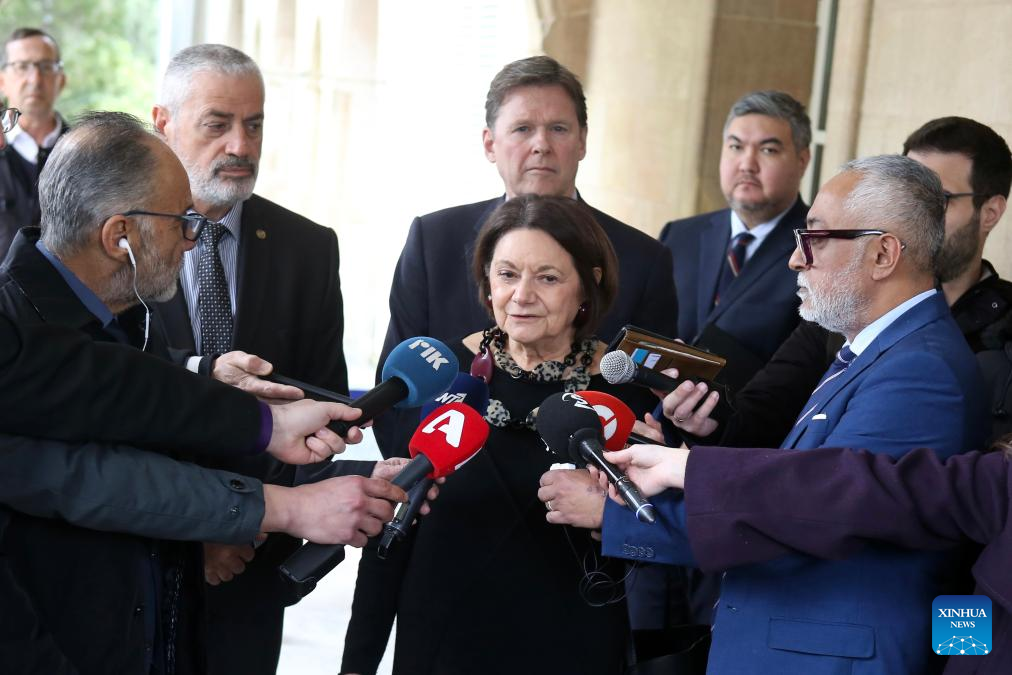UN Under-Secretary-General for Peacebuilding Rosemary DiCarlo (C) speaks to the media in Nicosia, Cyprus, on Feb. 10, 2025. The United Nations (UN) envoy met separately with Greek and Turkish Cypriot leaders on Monday, inviting them to an expanded meeting aimed at reviving stalled Cyprus peace negotiations in March. (Photo by George Christophorou/Xinhua)