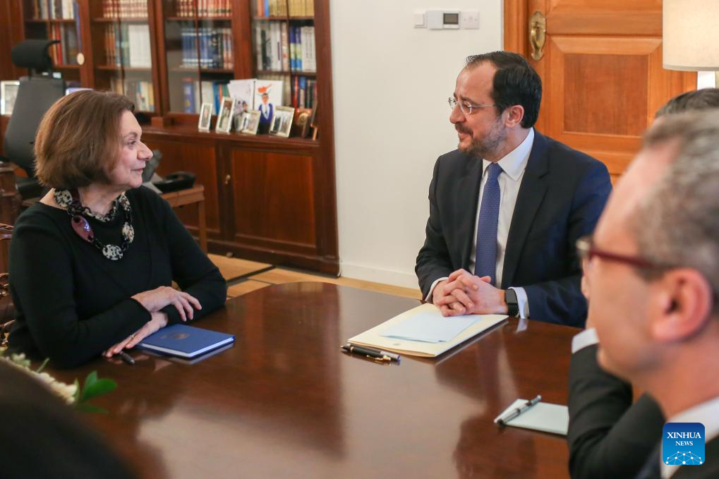 UN Under-Secretary-General for Peacebuilding Rosemary DiCarlo (L) meets with Cypriot President Nikos Christodoulides (C) in Nicosia, Cyprus, on Feb. 10, 2025. The United Nations (UN) envoy met separately with Greek and Turkish Cypriot leaders on Monday, inviting them to an expanded meeting aimed at reviving stalled Cyprus peace negotiations in March. (Photo by George Christophorou/Xinhua)