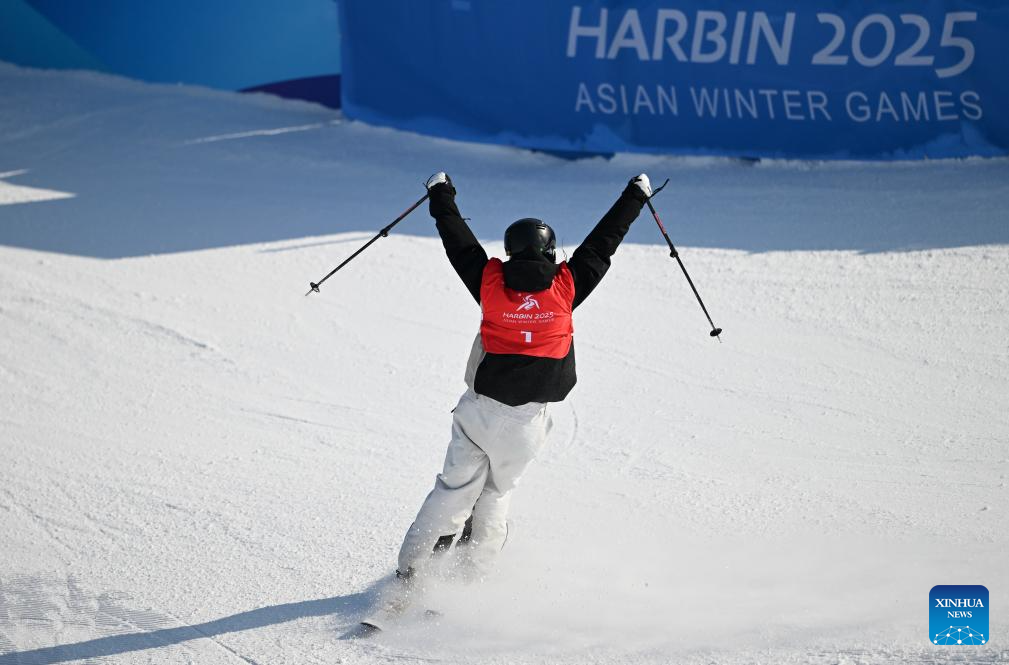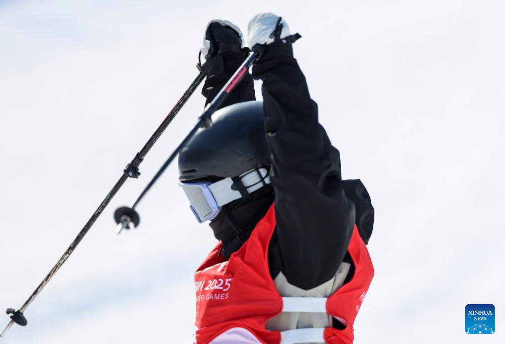 Liu Mengting of China celebrates during the Freestyle Skiing women's freeski slopestyle final at the 9th Asian Winter Games in Yabuli, northeast China's Heilongjiang Province, Feb. 11, 2025. (Xinhua/Yang Qing)