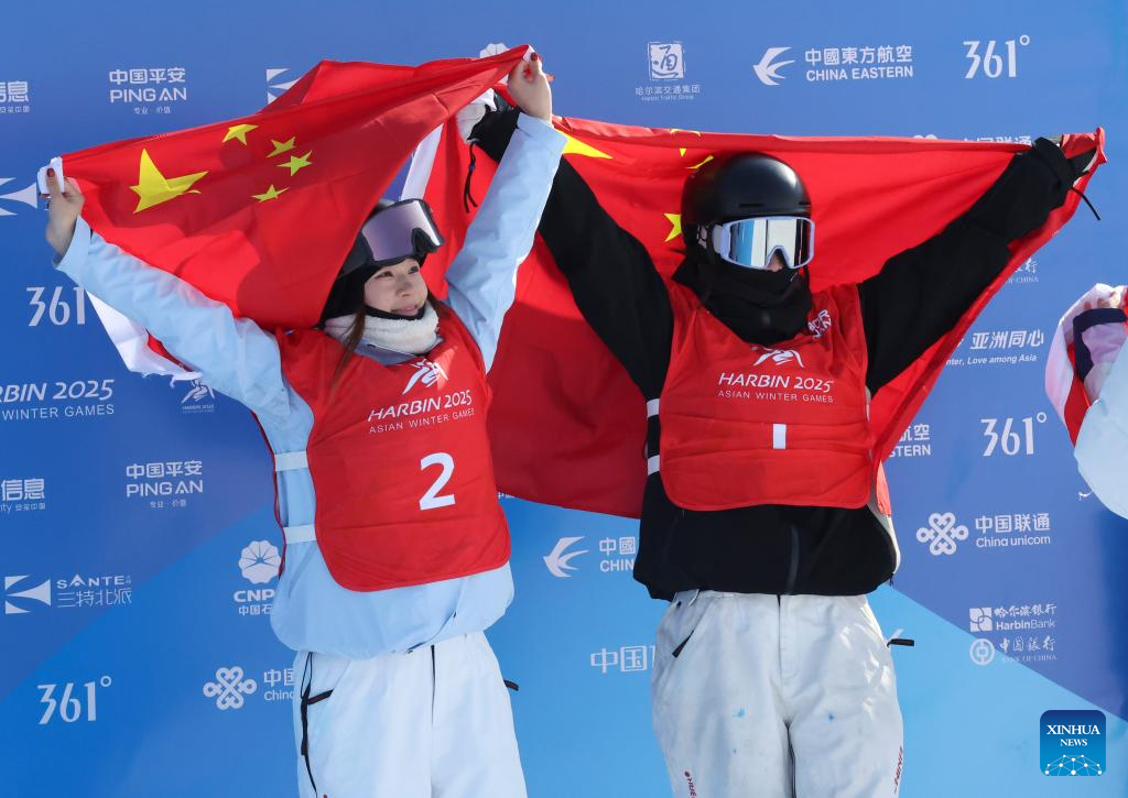 Liu Mengting (R) and Yang Ruyi of China celebrate after the Freestyle Skiing women's freeski slopestyle final at the 9th Asian Winter Games in Yabuli, northeast China's Heilongjiang Province, Feb. 11, 2025 (Xinhua/Yang Qing)