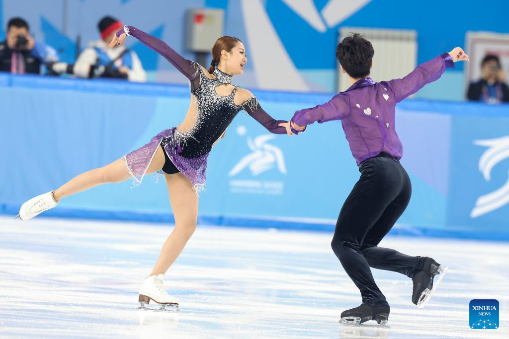 Tanaka Azusa(R)/Nishiyama Shingo of Japan perform during the ice dance rhythm dance of the figure skating event at the 9th Asian Winter Games in Harbin, northeast China's Heilongjiang Province, Feb. 11, 2025. (Xinhua/Lai Xiangdong)