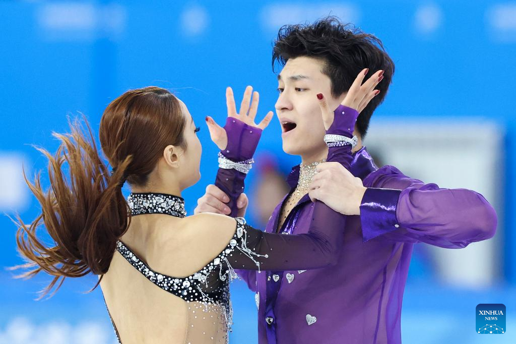 Ren Junfei (L) and Xing Jianing of China perform during the ice dance rhythm dance of the figure skating event at the 9th Asian Winter Games in Harbin, northeast China's Heilongjiang Province, Feb. 11, 2025. (Xinhua/Jiang Han)