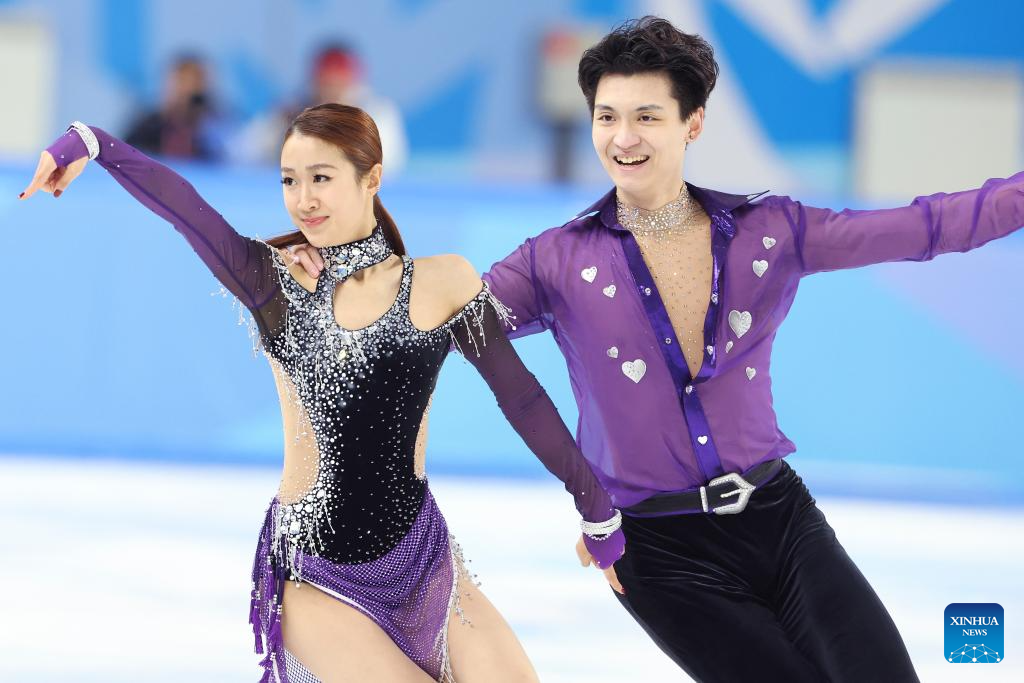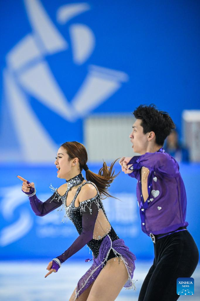 Tanaka Azusa(bottom)/Nishiyama Shingo of Japan perform during the ice dance rhythm dance of the figure skating event at the 9th Asian Winter Games in Harbin, northeast China's Heilongjiang Province, Feb. 11, 2025. (Xinhua/Lai Xiangdong)