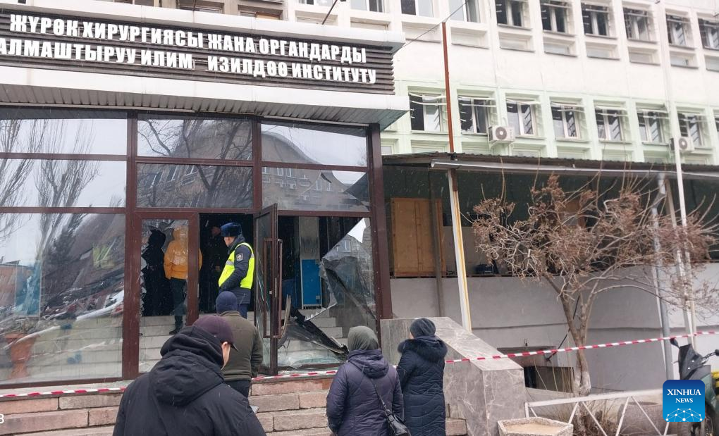 People gather at the site of a hospital fire in Bishkek, Kyrgyzstan, on Feb. 12, 2025. Two people were killed on Tuesday evening in a hospital fire in the Kyrgyz capital, the country's Health Ministry has said. (Str/Xinhua)