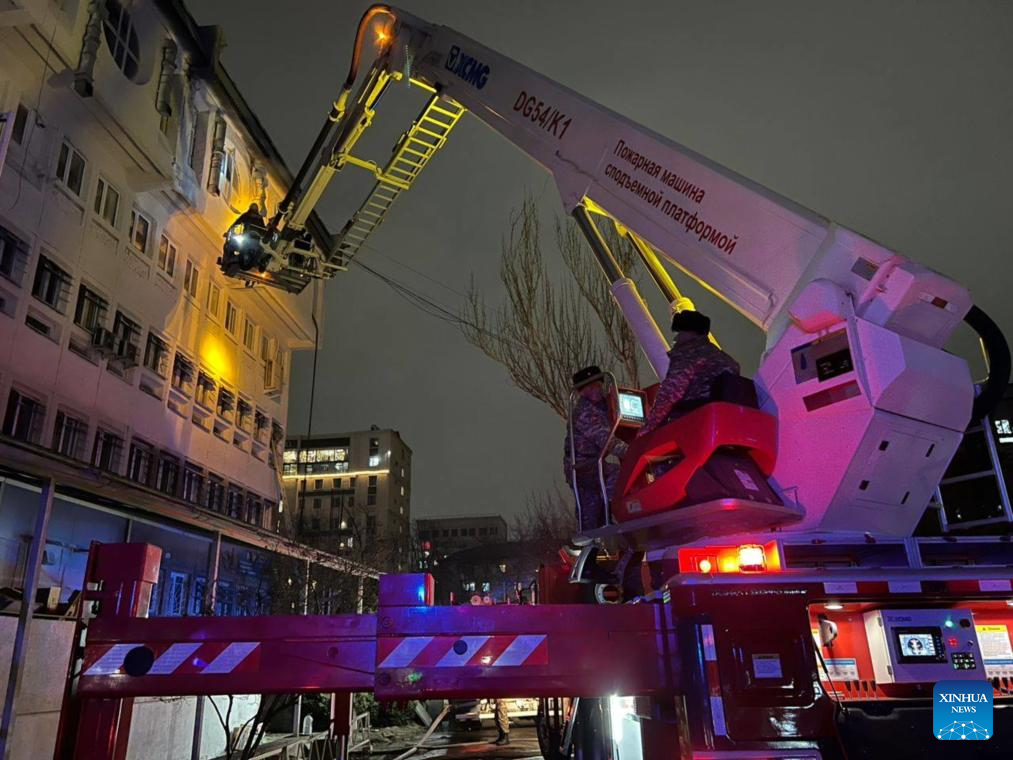 Firefighters work at the site of a hospital fire in Bishkek, Kyrgyzstan, on Feb. 11, 2025. Two people were killed on Tuesday evening in a hospital fire in the Kyrgyz capital, the country's Health Ministry has said. (Str/Xinhua)