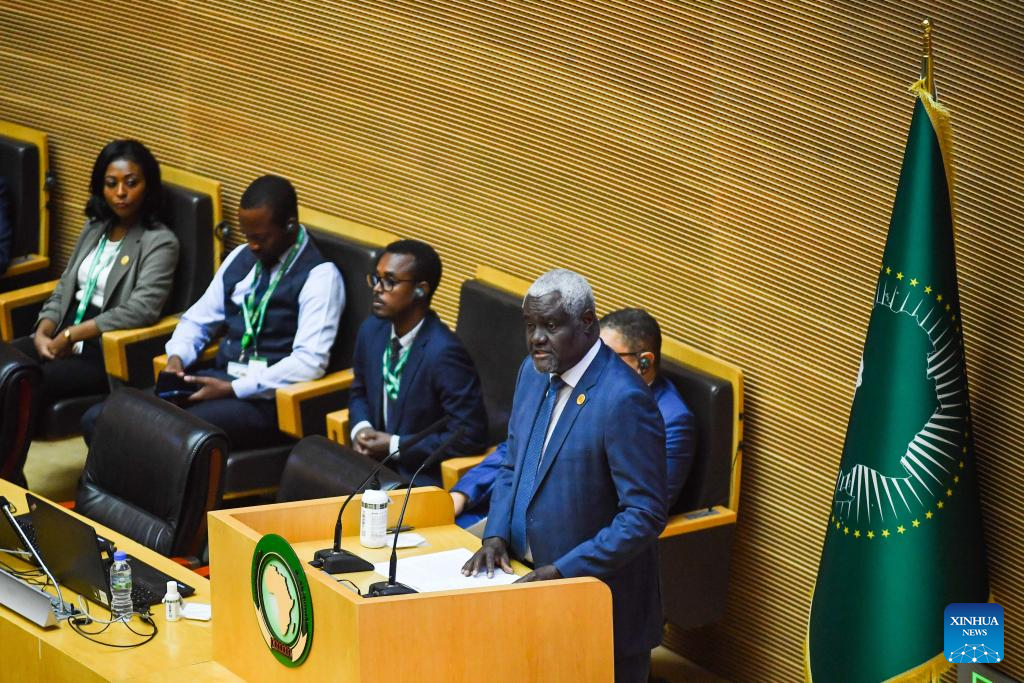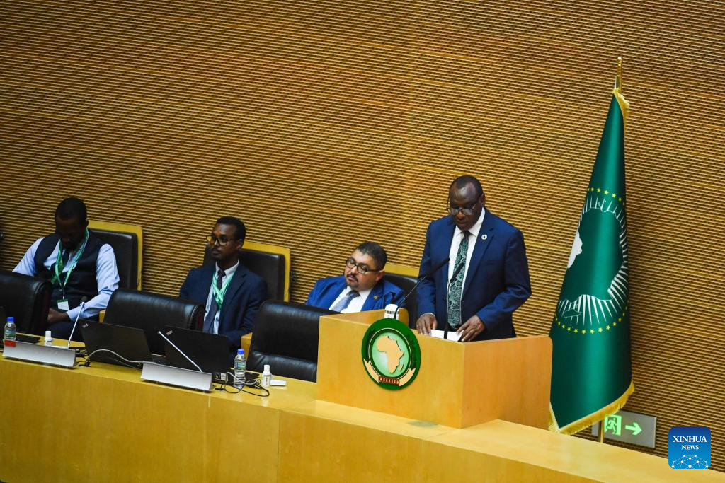 Chairperson of the African Union (AU) Commission Moussa Faki Mahamat (Front) addresses the 46th Ordinary Session of the Executive Council of the African Union (AU) at the AU headquarters in Addis Ababa, Ethiopia, on Feb. 12, 2025. Faki warned on Wednesday that violent conflicts continue to undermine peace and security in Africa. (Xinhua/Michael Tewelde)