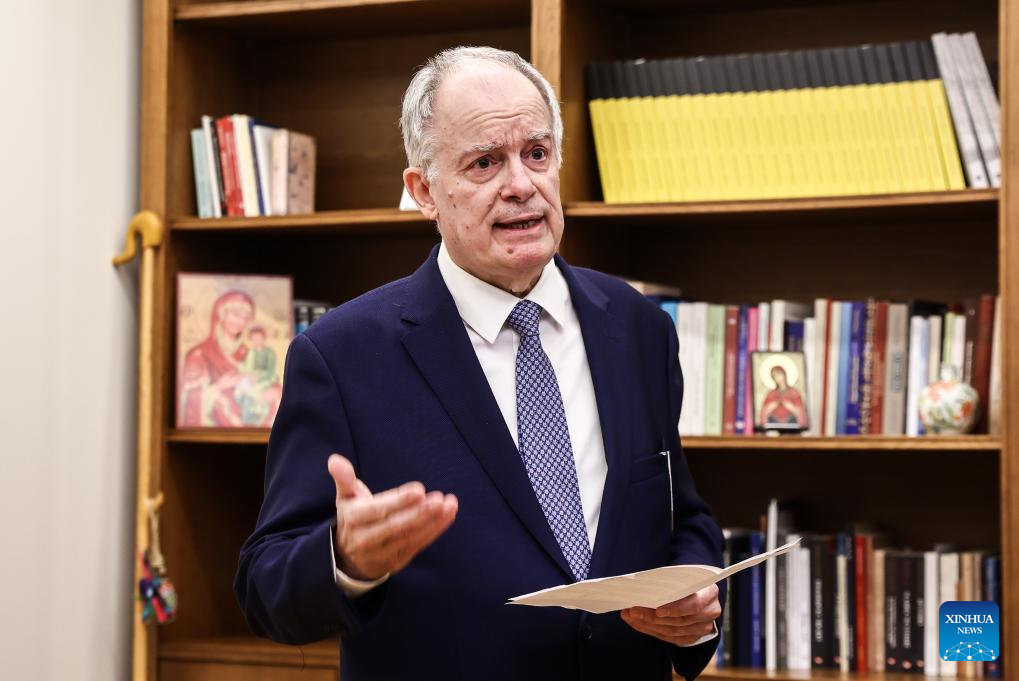 Constantine Tassoulas speaks to media after the results of the election at the Greek Parliament in Athens, Greece, on Feb. 12, 2025. Constantine Tassoulas, former speaker of the Greek Parliament, was elected as the country's new president on Wednesday. (Xinhua/Marios Lolos)