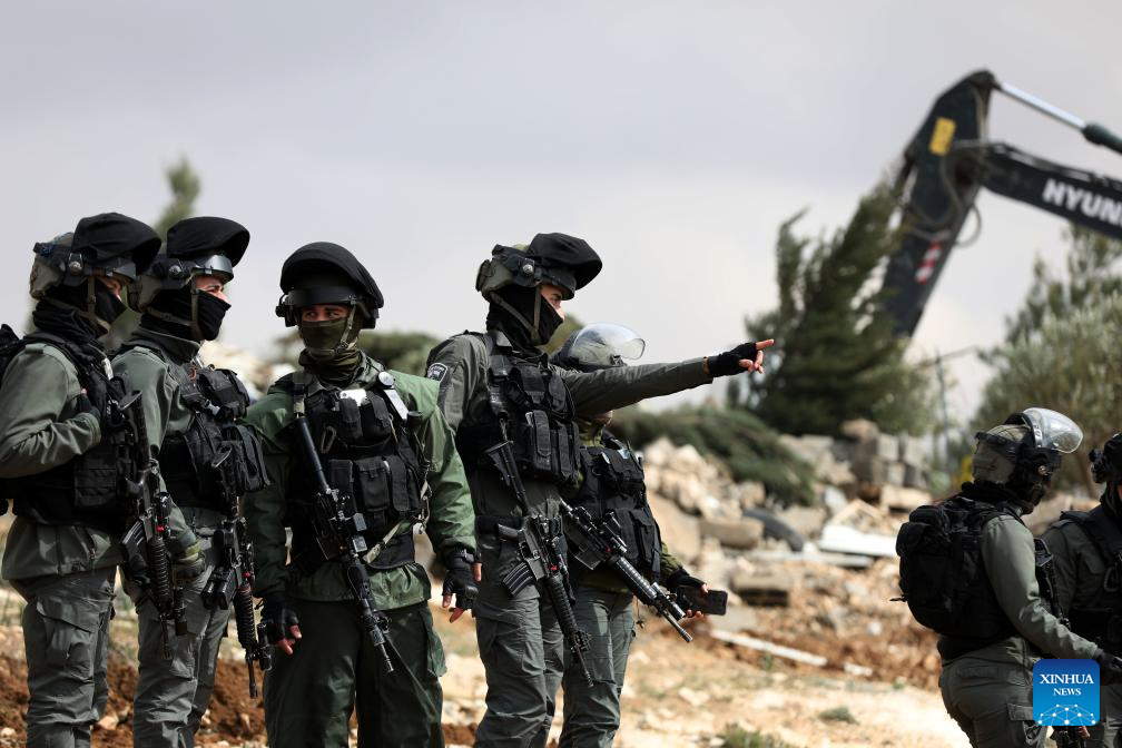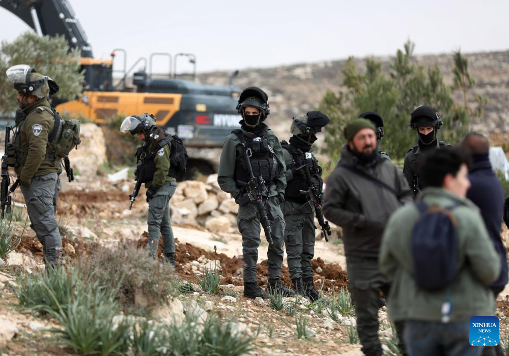 Israeli soldiers are seen as an Israeli military bulldozer demolishes a Palestinian house, in Masafer Yatta, south of the West Bank city of Hebron, on Feb. 10, 2025. (Photo by Mamoun Wazwaz/Xinhua)