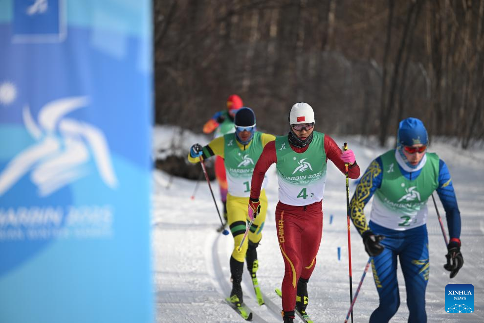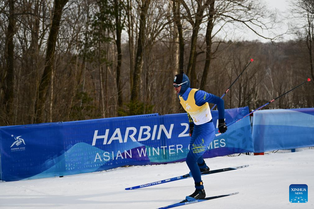 Olzhas Klimin of Kazakhstan competes during the Cross-Country Skiing men's 4x7.5km relay match at the 9th Asian Winter Games in Yabuli, northeast China's Heilongjiang Province, Feb. 12, 2025. (Xinhua/Zhang Long)